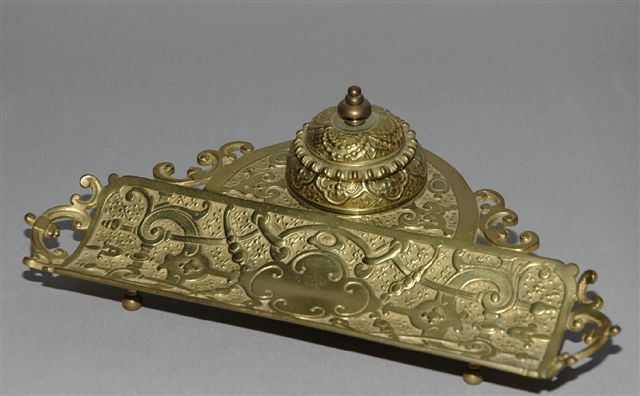 Encrier en bronze doré style Renaissance avec un plateau plumier, et porte godet encrier à couvercle charnière. Décor floral, circa fin 19ème.