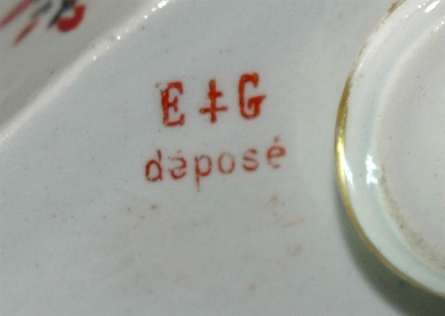 Écritoire de forme buffet à fronton pour deux godets encriers et un tiroir rangement dans la base. Le décor pourpre et gris est à motif floral et d'oiseaux sur toutes les parties. Le dosseret présente en son centre un médaillon enrubanné à décor champêtre pourpre. Les bordures sont surlignées de pourpre, gris et or. Signature à la croix de Lorraine encrée rouge : GALLE et NANCY, circa 1879-1889. (30cm ; 20cm ; 21cm) ; (reproduit p. 95 ref. f 043)