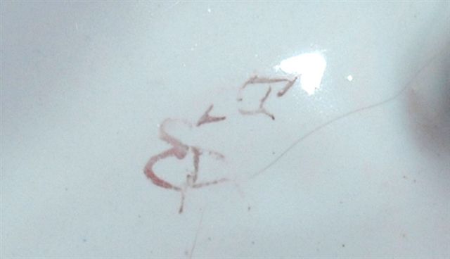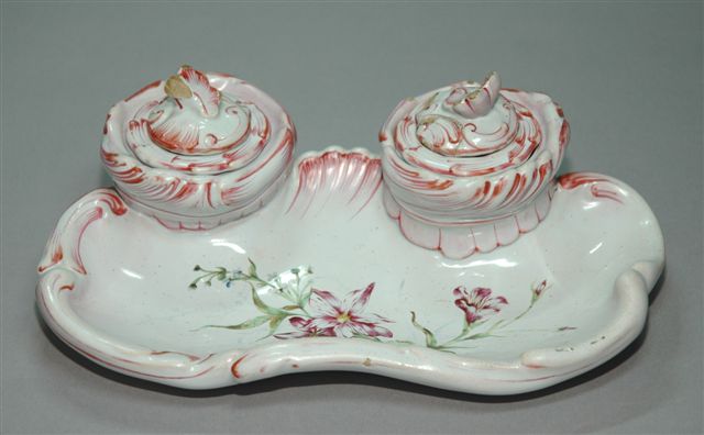Écritoire plumier forme rocaille avec deux portes godets encriers couverts, sortes de gros boutons floraux. Décor à liseré pourpre et de fleurs. Signature cursive encrée rouge : SAINT CLEMENT. (24cm / 15cm / 9cm), (petites égrenures)