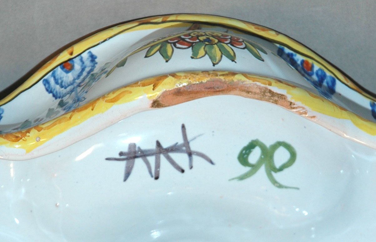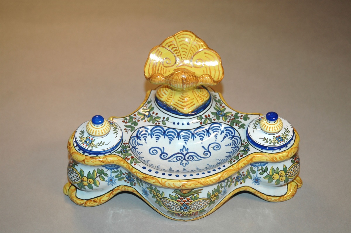 Très rare écritoire terrasse rocaille modèle aux paniers fleuris. Deux godets encriers couverts sur une terrasse portant en son milieu une structure repose plume en forme de champignon de couleur ocre. Signature A M pour ANTOINE MONTAGNON et noeud vert, circa 1875 / 1889. (24,5 / 17 / 18cm)