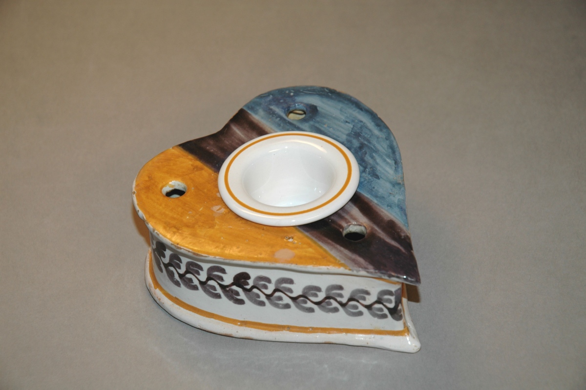 AUXERROIS / NIVERNAIS, 18ème, encrier en forme cur, décor de guirlandes sur le pourtour et de larges bandes sur le dessus, pour un godet encrier et trois trous pique plume. Larg. 11, haut., 5cm.