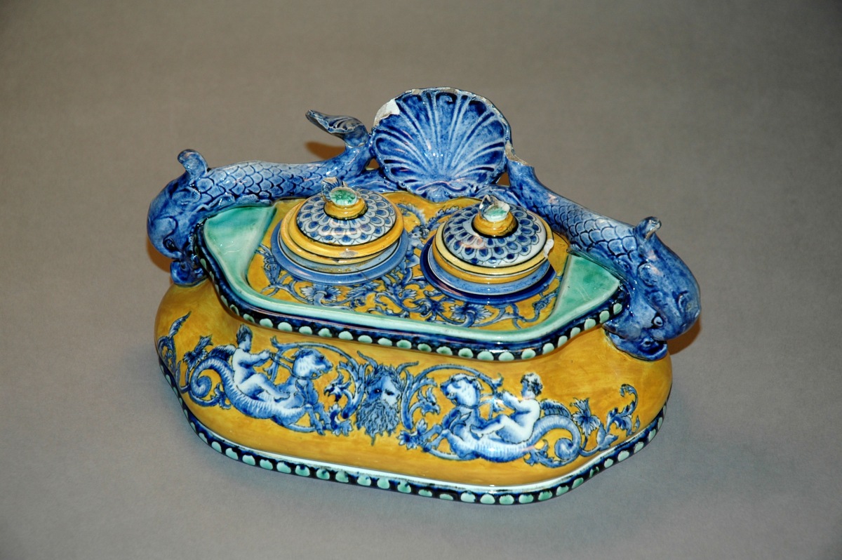 Écritoire aux " Dauphins " pour deux godets encriers couverts, décor italien n° 28 sur fond jaune. Marque GIEN au château, circa 1876. (20cm / 14cm / 10cm)