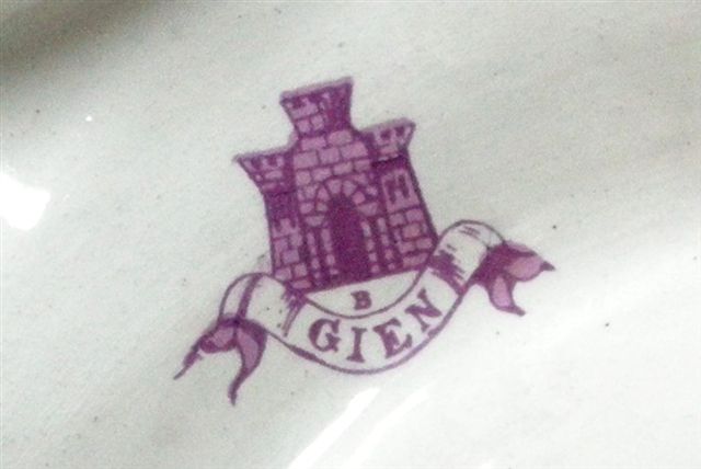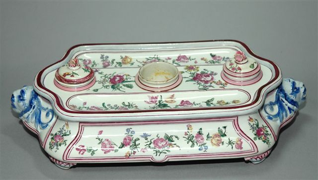 Écritoire aux "Têtes de lion" pour trois godets encriers couverts, décor de Marseille aux roses en fleurs. Marque GIEN au château, circa 1871 à 1876. (38cm / 20cm / 9cm)