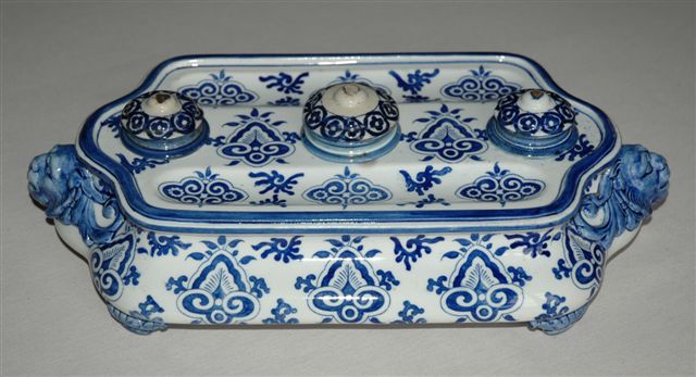 Écritoire aux "Têtes de lion" pour trois godets encriers couverts, décor Rouen bleu. Marque GIEN lettres entremêlées, circa 1871 à 1876. (38cm / 20cm / 9cm)