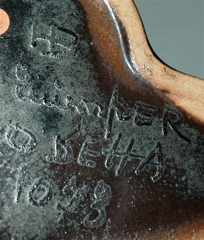 Encrier en grès forme cur pour un godet et trois trous pique plume le décor est à glaçure émaillée brune, bleue, rouge rehaussé d'or. Pièce particulière appartenant aux séries des défournements évènementiels signés " ODETTA ". Marque au revers HB QUIMPER ODETTA pour la Manufacture La Hubaudière, 1922. (13cm ; 12 cm ; 5,5cm)
