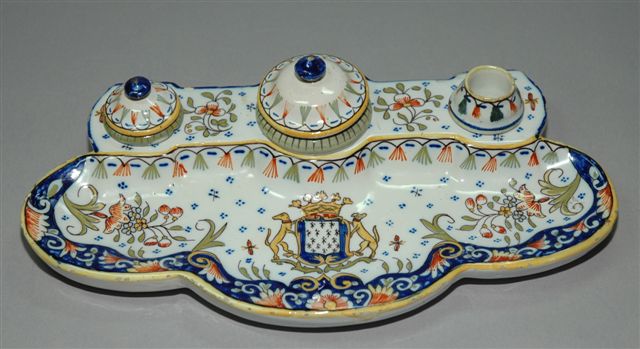 Écritoire forme plumier à plateau trilobé en avant d'une petite terrasse portant trois godets dont deux encriers couverts et le plus petit pour les plumes. Le décor en polychromie de Desvres mélangeant les motifs de Rouen et Quimper avec en plus les armoiries de la ville de St Brieuc. Signature GM pour Géo Martel, circa 1900 / 1924.