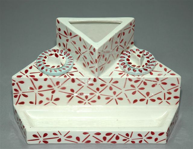 Écritoire Art Déco en triple niveau de forme trapézoïdale avec plumier sur la base, deux godets encriers avec bouchons sur la terrasse intermédiaire et boîte de rangement ou range plume en la partie supérieure qui fait office de dosseret. Le décor est à motif floral rouge sur couverte blanche. Marque de la Faïencerie De Onnaing, circa 1920 / 1930.
