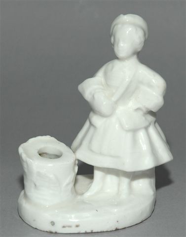 Encrier porcelaine en blanc et or de la série des personnages militaires : ici la cantinière. circa XIXème. Haut. 14 cm.