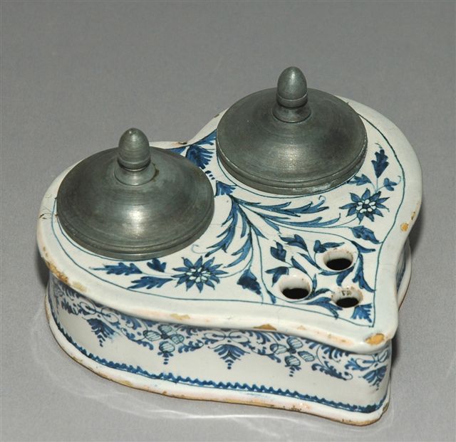 Encrier en faïence en forme de cur époque XVIIIème siècle à décor de lambrequins, d'une fleur de lis et de feuillage traité en camaïeu de bleu sur couverte blanche. Pour deux godets encriers en faïence avec bouchons charnières en bronze et deux trous pique plume.