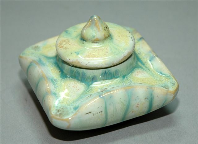 Encrier Art Nouveau en grès, forme d'un petit flacon carré aux bords relevés pour un godet encrier centré, avec son bouchon. Le décor est d'un émaillage turquoise pâle. Signature au stylet en creux DALPAYRAT et n°71 vers 1889-1899. (8cm ; 8cm ; 6,5cm)