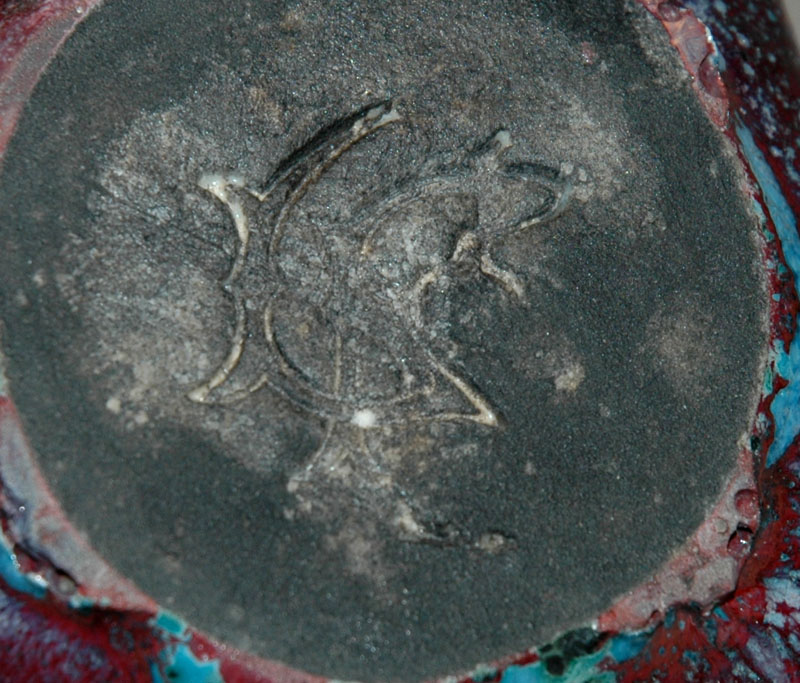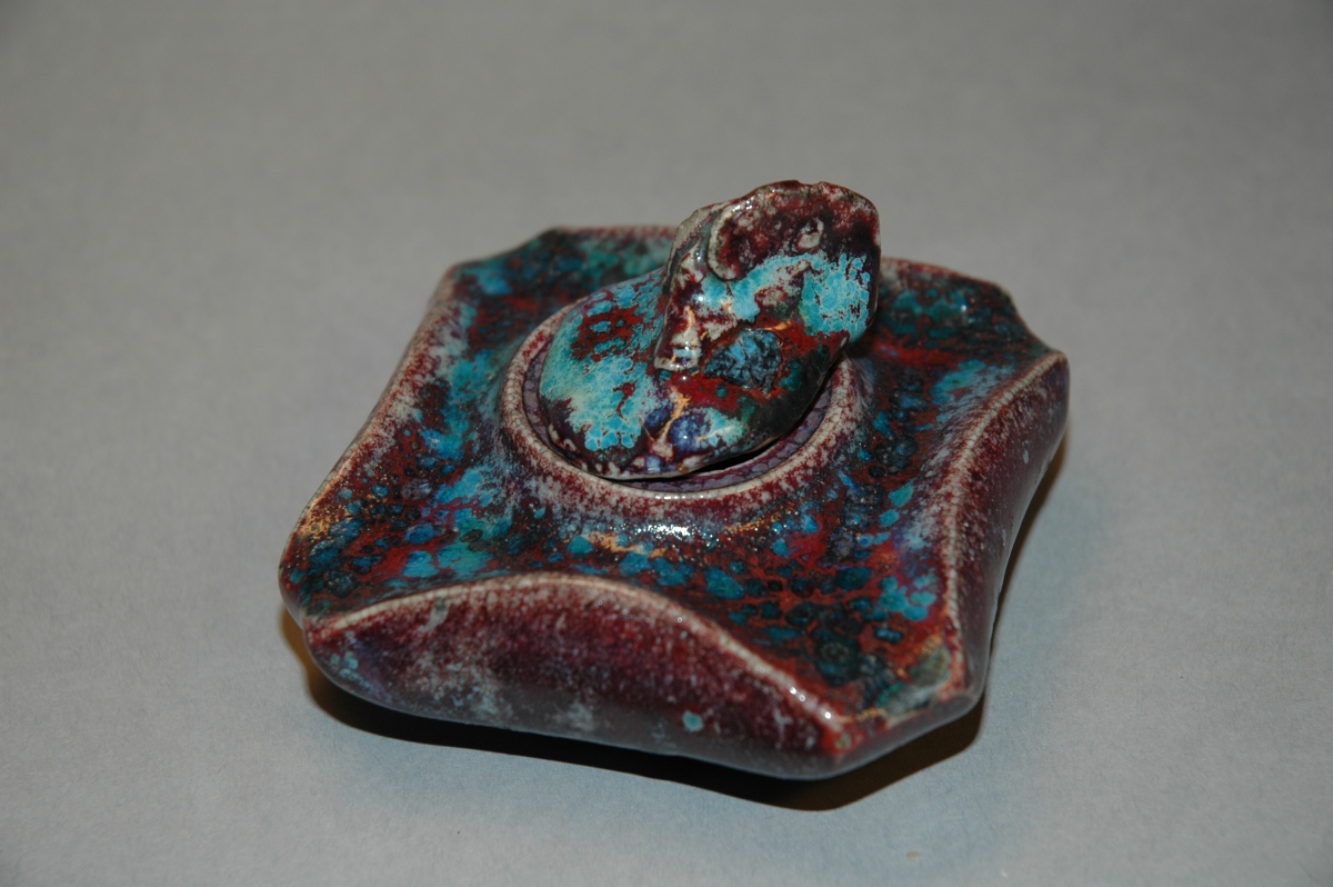 Encrier Art Nouveau en grès, forme mouvementée bords relevés pour un godet encrier centré, avec son bouchon. Le décor est typique par l'émaillage particulier du coloris sang de boeuf, et bleu / vert. Signature au stylet en creux par les lettres L ET F (?), se chevauchant, (8cm ; 8cm ; 6cm), vers 1889-1900. (Petits éclats sur le bouchon)
