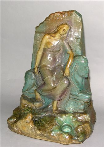 Encrier Art Nouveau en grès sur le thème de la femme. Le plateau de forme rocaille reçoit un godet encrier sur le devant d'un dosseret pyramidal décoré en bas relief d'une jeune femme assise sur une sphinge. Oeuvre du sculpteur H. LEVASSEUR dont la signature figure en creux sur la base à droite. (30cm ; 23cm ; 42cm)