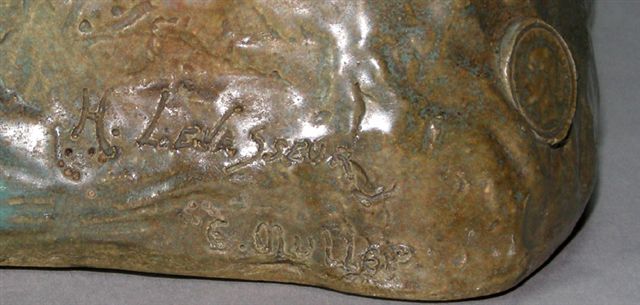 Signature et cachet en creux sous la pièce: reproduction interdite sur le côté droit, un second cachet rond en creux comme un sceau avec son profil et au-dessus GRES EMILE MULLER, vers 1875.