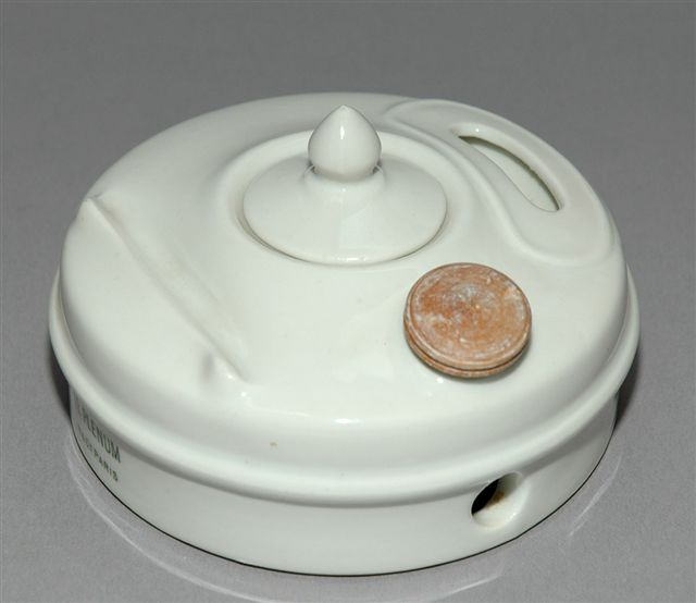 Encrier " Le Plenum ", breveté encrier inversable et à longue conversation de l'encre. L'encrier est centré, en forme d'entonnoir avec bouchon, goulotte repose plume et trou de remplissage sur le côté avec son bouchon. Existait en plusieurs versions : porcelaine blanche avec réceptacle éponge (modèle présenté) ou sans, à décor de bluets, en verre ou en cristal. Marque LE PLENUM H & CIE PARIS. Début 20ème, 1912 / 1925. Diam. 13, haut. 8 cm.