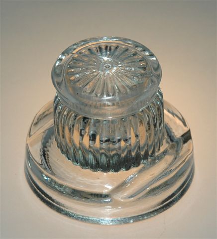 Encrier cylindrique sur une base à deux rainures repose plume et avec bouchon en verre moulé translucide Début XXème. Diam. 8, haut. 6 cm.