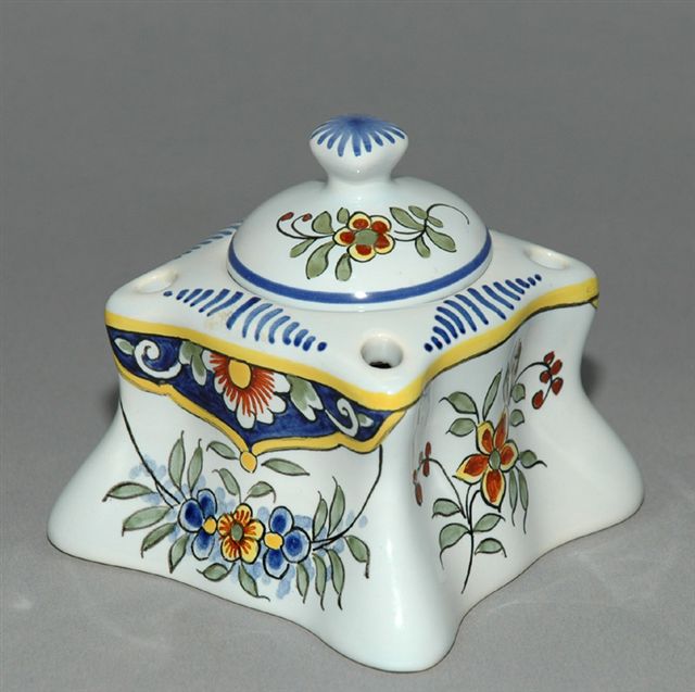 Encrier forme pyramidale au décor de Rouen en bleu et liseré jaune, pour un godet encrier avec bouchon à prise bouton et quatre trous pique plumes. Fabrique Géo Martel à Desvres.