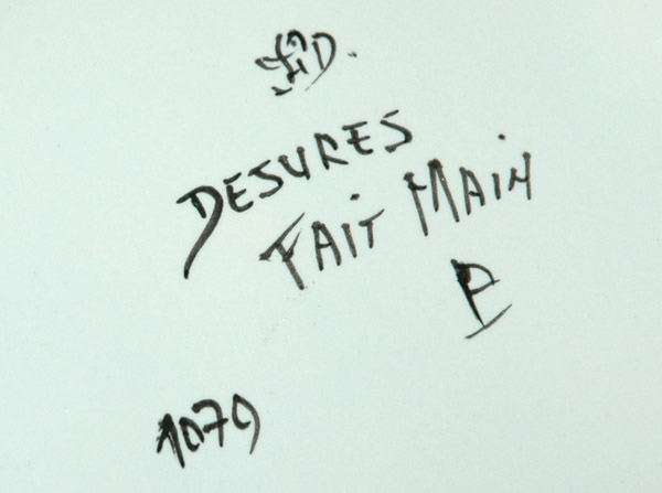 Encrier forme commode au décor de Rouen et liseré bleu, pour un godet encrier avec bouchon à prise bouton et deux trous pique plumes. Le plateau amovible recèle une boîte de rangement. Fabrique Fourmaintraux-Dutertre à Desvres.