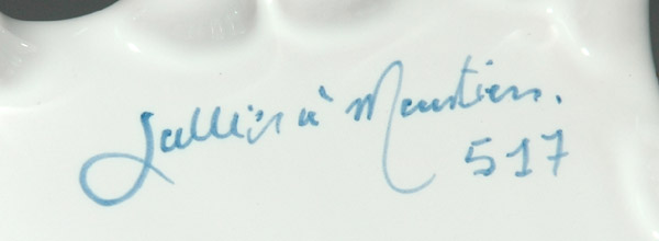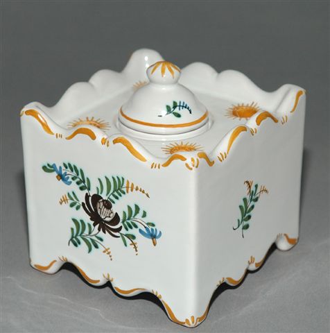 Encrier forme cubique à bords supérieurs festonnés pour usage de repose plume, décor de Moustiers et liseré jaune, pour un godet encrier avec bouchon à prise bouton et quatre trous pique plumes. Fabrique Lallier à Moustiers.