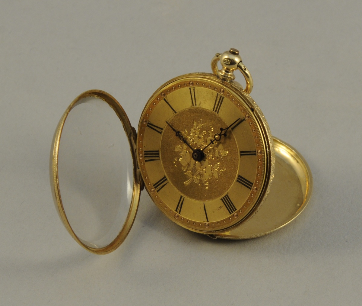 MONTRE de dame à clef à remontage par le fond en or jaune guilloché, cadran doré à chiffres romains.