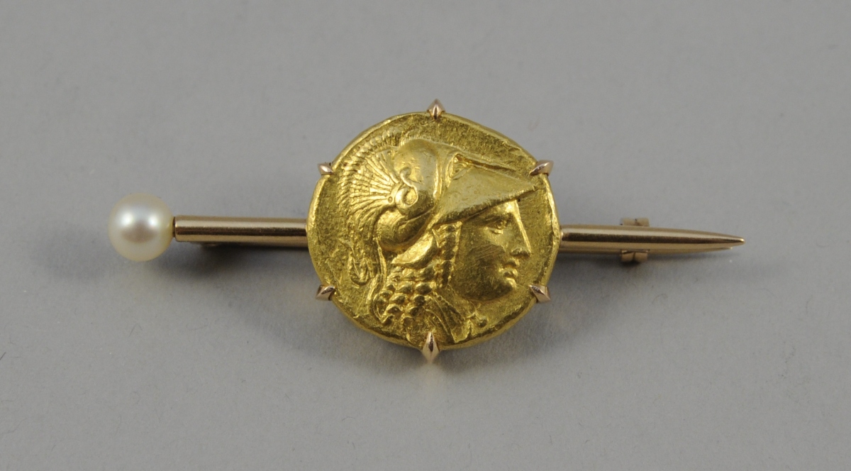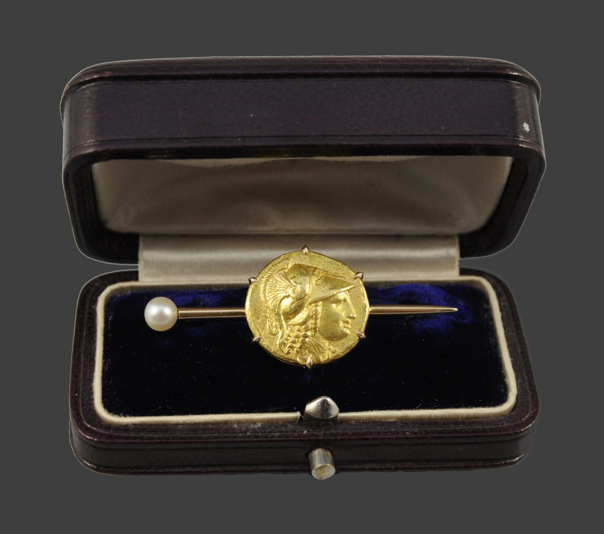 STATÈRE en or d'ALEXANDRE LE GRAND monté en épingle à cravate elle-même ornée d'une perle. Poids brut : 13 g.