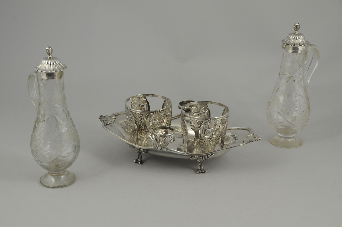 HUILIER-VINAIGRIER en argent. Plateau navette mouluré et orné de feuilles d'acanthe reposant sur quatre pieds à décor de pampres et terminés par des volutes. Porte-burettes décorés de pampres et de rinceaux. Porte-bouchons ornés de feuillages. Bouchons en argent godronnés, fretels en forme de graine.