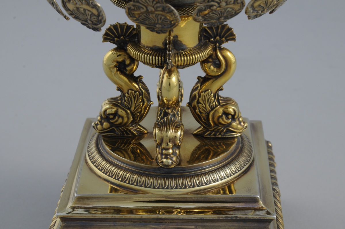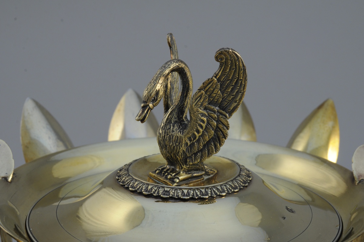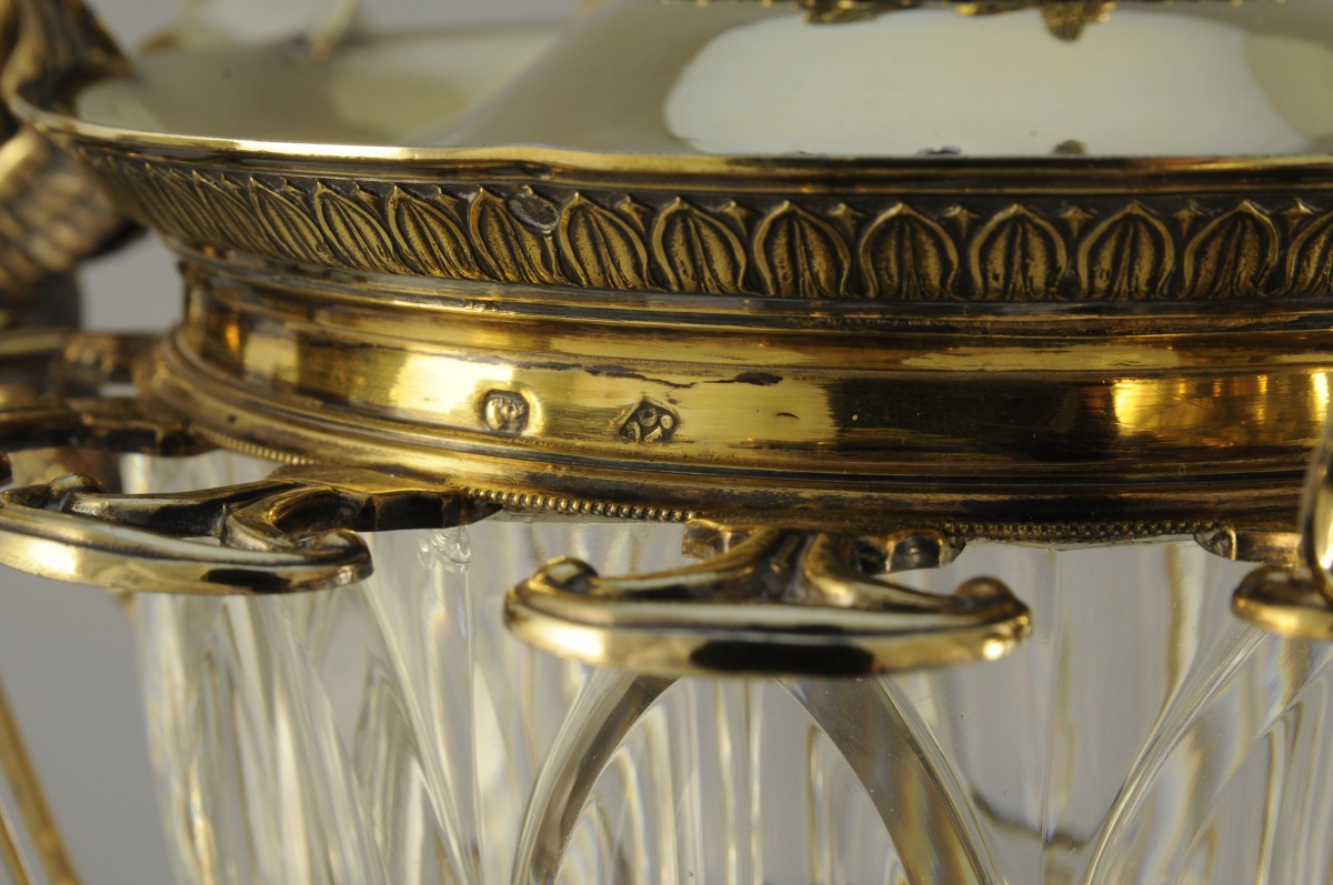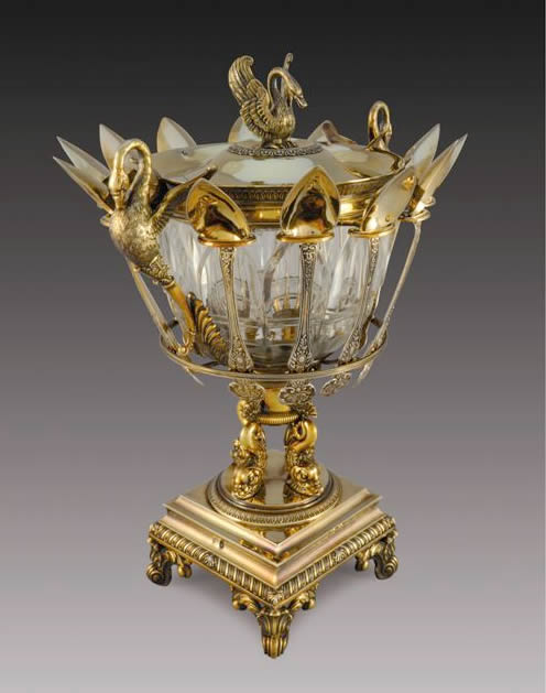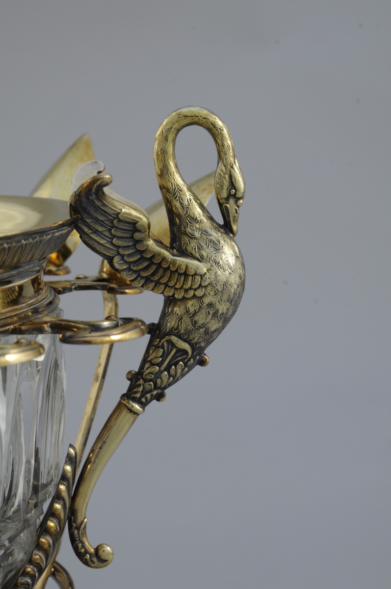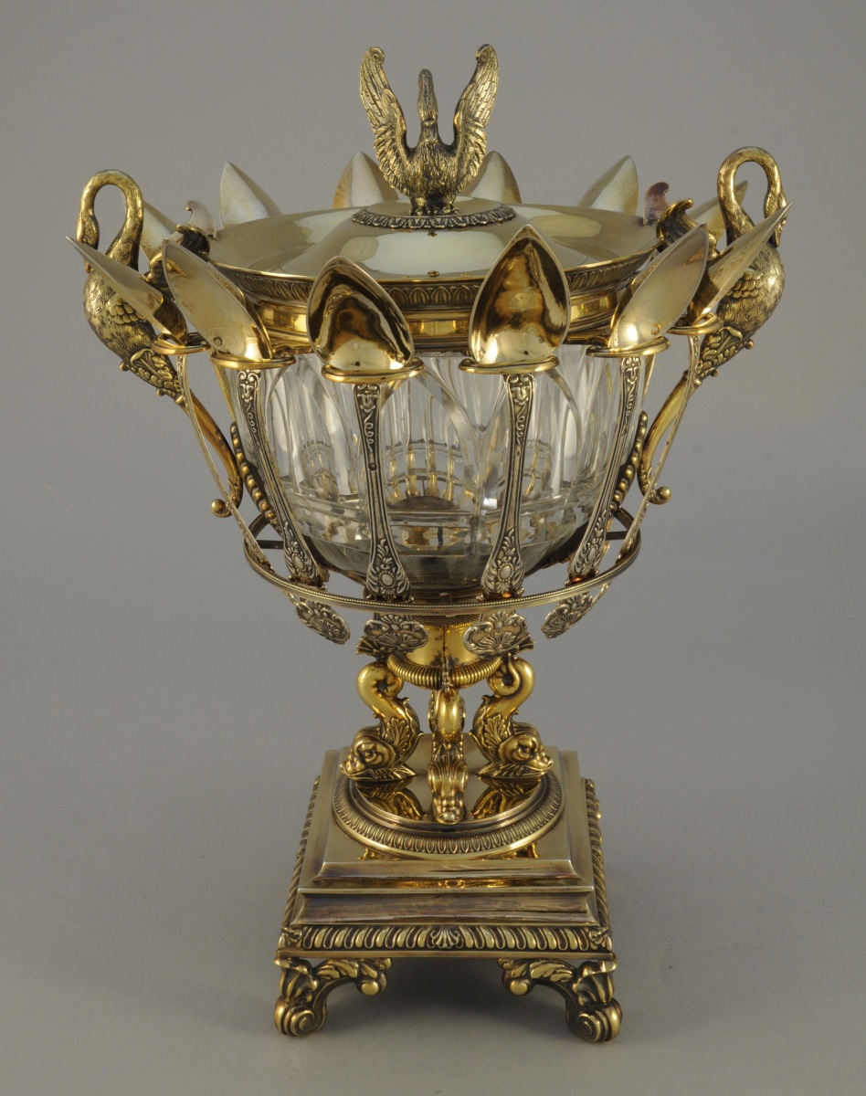 CONFITURIER en vermeil et cristal porté par quatre dauphins réunis sur un socle rectangulaire à quatre pieds en enroulements. Feuilles d'oves, coquilles et godrons. Anses et fretel en forme de cygnes aux ailes déployées. Douze petites cuillères en vermeil. Réceptacle en cristal à feuille d'oves.