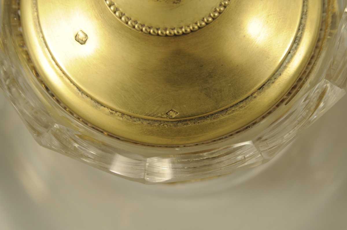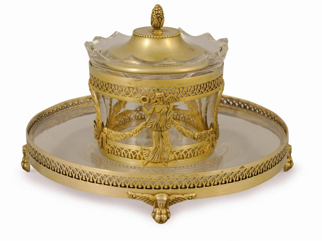 ENCRIER en cristal taillé et vermeil ciselé. Décor tournant de femmes drapées à l'antique, guirlandes de fleurs et couronnes de laurier rubanées. Frises lancéolées ajourées. Couvercle sommé d'un fretel en forme de graine. Le godet présente le rebord taillé en couronne. Il pose sur une coupelle reposant sur quatre pieds, griffes à tête de sphinx ailé.