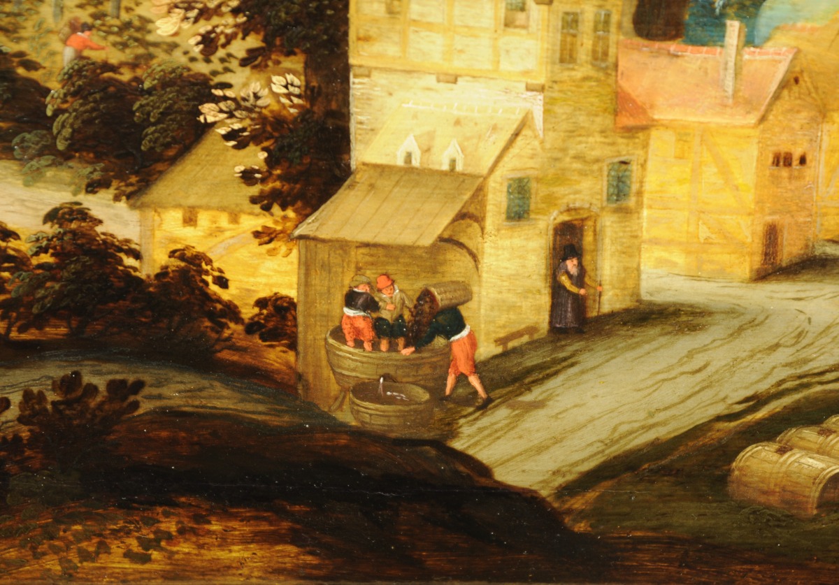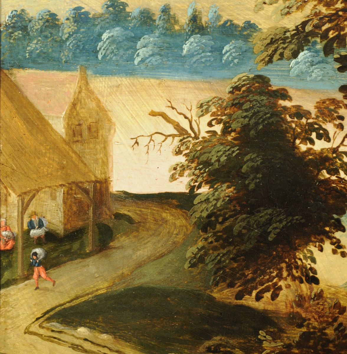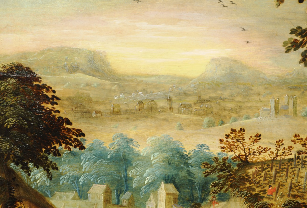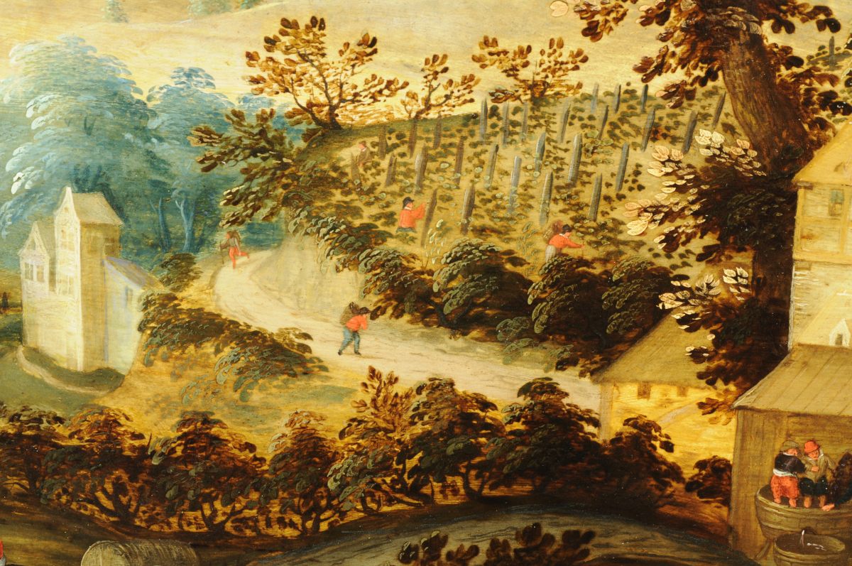 Peintre anversois connu pour ses scènes champêtres, Abel Grimmer inscrit sa peinture dans la droite lignée des primitifs flamands. Fils du paysagiste Jacob Grimmer, il est reçu Maître de la Guilde de Saint-Luc en 1592. Il réalise, cette même année, son chef d'uvre des douze mois pour la chapelle Notre-Dame de Montfaucon-en-Velay. Les activités saisonnières de l'homme sont le cadre, dans des paysages en mouvement de paraboles christiques. Il puise son inspiration dans les gravures de Bruegel et d'Hans Bol. Les Saisons et les Mois de l'année sont l'un de ses thèmes les plus répandus dans les musées et collections privées. Abel Grimmer partage, avec son père, la schématisation des figures et des paysages, l'harmonie des couleurs à partir d'une palette douce et une composition linéaire. Le rendu méticuleux des architectures et des perspectives distingue l'uvre du fils de celle du père. Abel a en effet suivi une formation d'architecte dans sa jeunesse. Ses recherches sur ce thème inspirent une nouvelle génération de peintres comme Pieter Saenredam, célèbre pour ses intérieurs d'églises. Charmante, naïve et subtile, l'uvre de Grimmer fils puise ses qualités dans les fondements de la peinture flamande. Elle marque un tournant vers le XVIIème siècle, le Siècle d'Or.