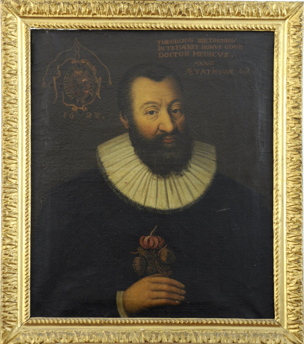 Théodore (I) Bretonneau (Beaulieu les Loches, 1566 - Chartreuse du Liget, 1636) : Docteur en médecine de la paroisse de Saint-Laurent de Beaulieu- les-Loches, auteur d'une complainte en vers français sur le " Trépas de Jean Edouard du Monin, poète et philosophe ", publiée lors de ses études en 1586. Fils de René Bretonneau, le Professeur Aron le juge moins brillant que son père. Il est également l'auteur d'un " Traité de la maladie pestilentielle qui sévit à Loches en l'an 1597 ". Il est représenté tenant dans la main une fleur de pavot, avec des armes dans un cartouche.