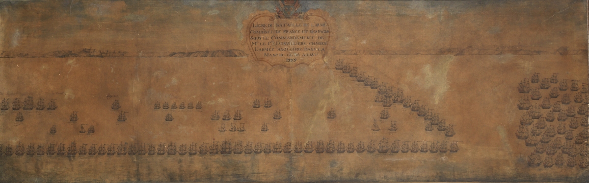 Titré en haut dans un cartouche LIGNE DE BATAILLE DE L'ARME / COMBINEE DE FRANCE ET D'ESPAGNE / SOUS LE COMMANDEMENT DE / Mrs DORVILLIERS. CHASSENT / L'ARMEE ANGLOISE DANS LA / MANCHE LE 26 AOUST 1779.