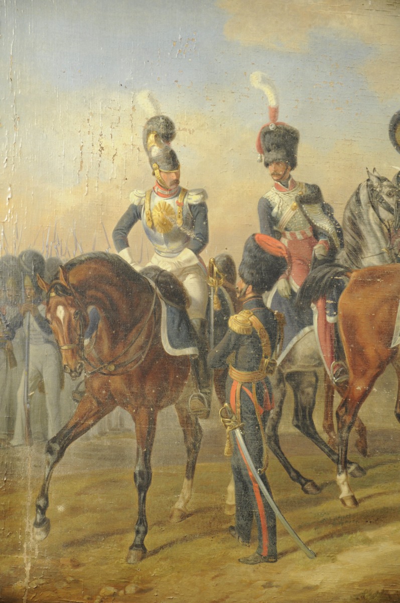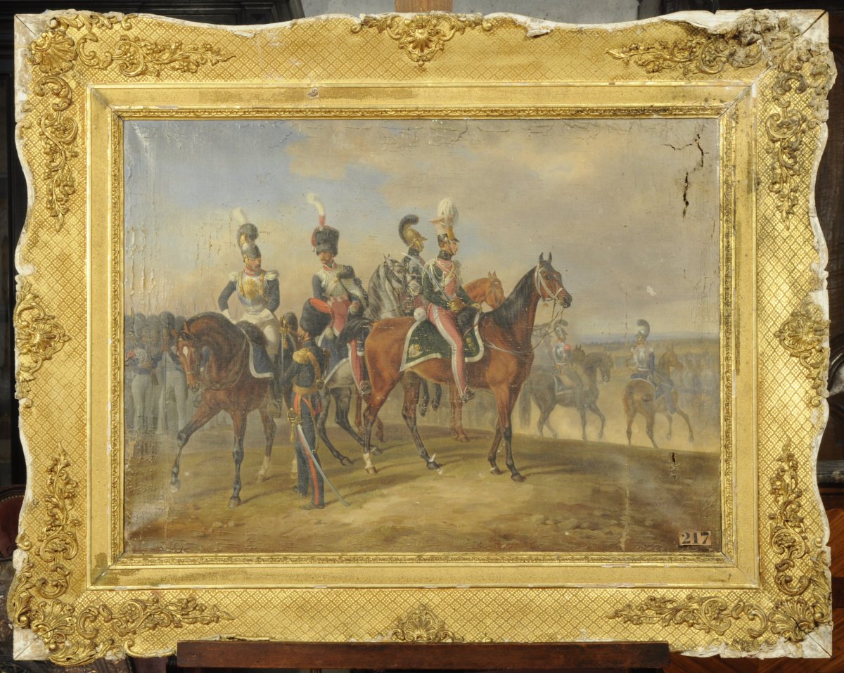 Cette toile représente une revue militaire avec, au premier plan, des soldats de la Garde Royale du Roi Louis XVIII. De gauche à droite on distingue un cuirassier, un artilleur à cheval, un hussard, un dragon et enfin un chevau-léger.