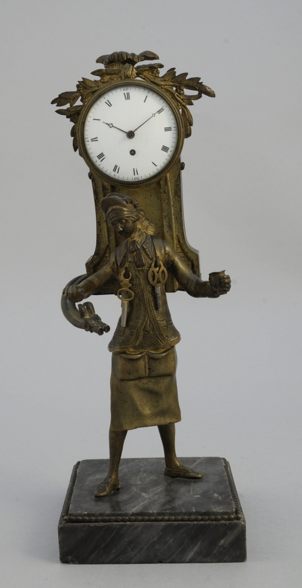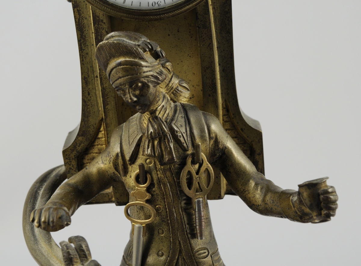 PENDULE AU MARCHAND D'EAU en bronze ciselé et doré à décor d'un personnage portant, sur son dos, une fontaine à eau dans laquelle est inscrit le mouvement. Base carrée en marbre gris ornée de rais de perle. Mécanisme signé "TARGE à Paris".