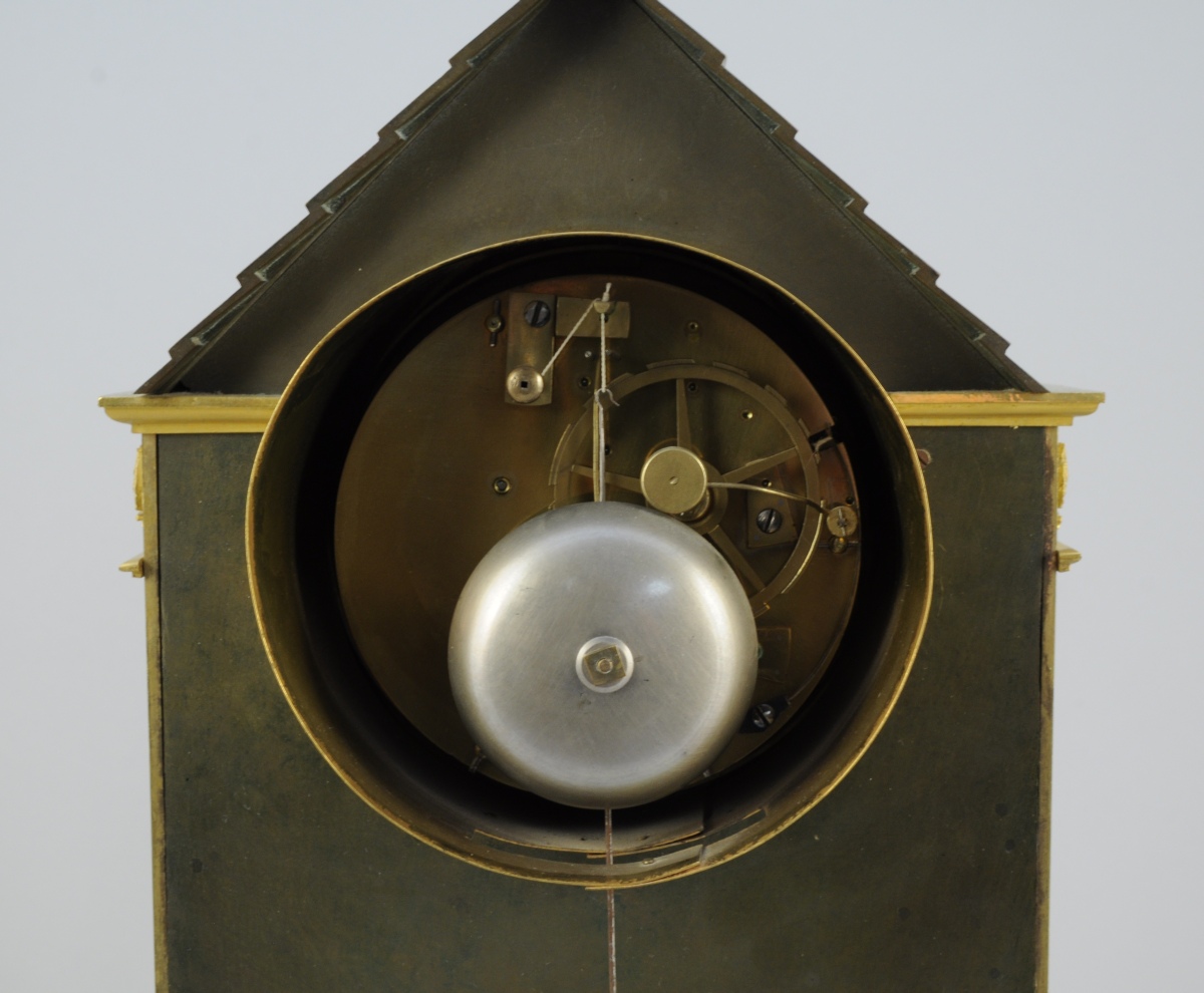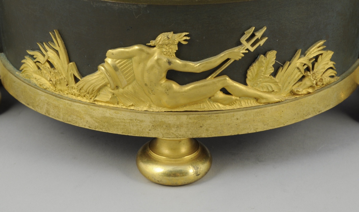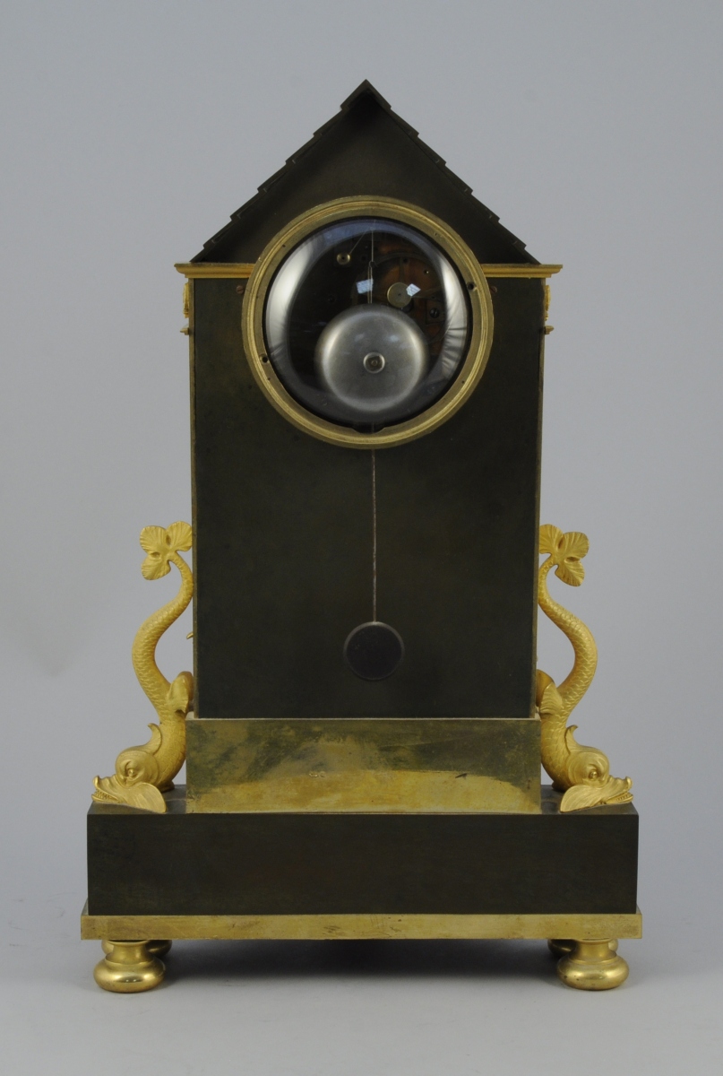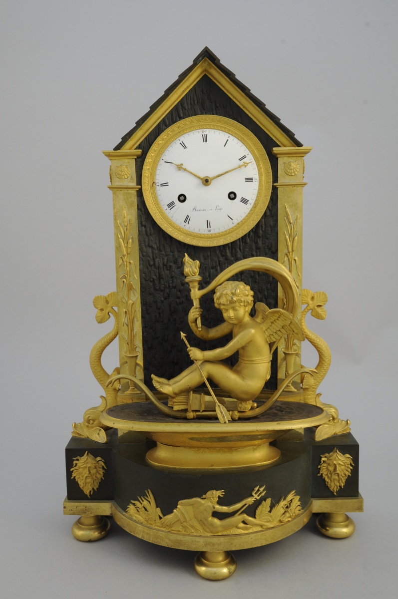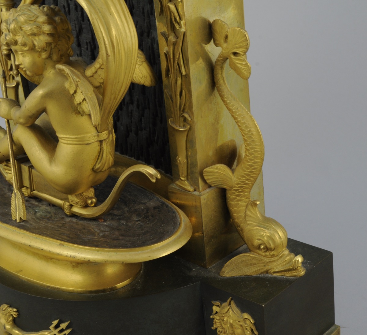 PENDULE en bronze ciselé, patiné et doré figurant l'Amour, assis sur son arc et son carquois, voguant dans un bassin. D'une main, il pagaie avec une flèche et, de l'autre, il brandit un flambeau drapé. La cage, de forme architecturée, présente un fond simulant la paroi d'une grotte encadrée de pilastres ornés de roseaux et de coquilles. Deux dauphins la soutiennent. La terrasse est agrémentée de masques de vieillard et du dieu Poséidon brandissant son trident.