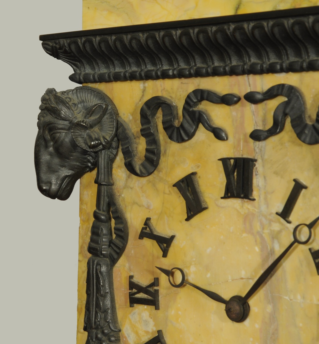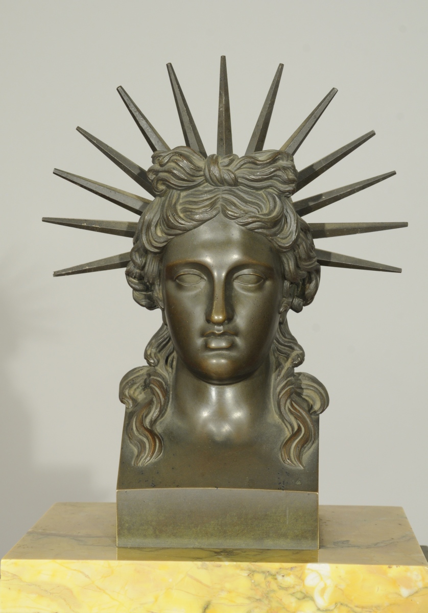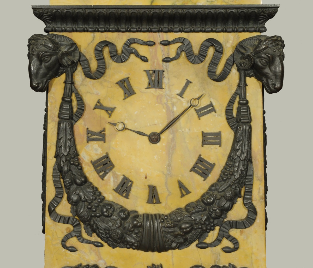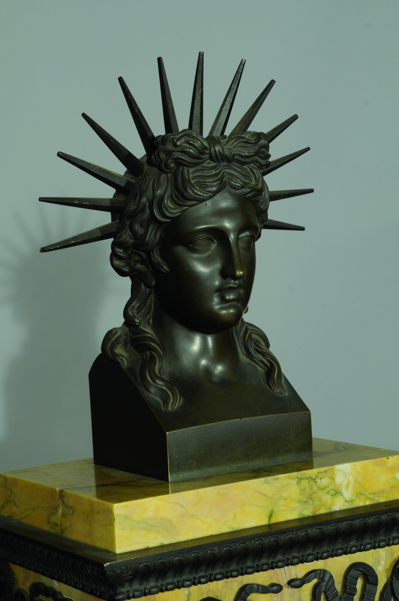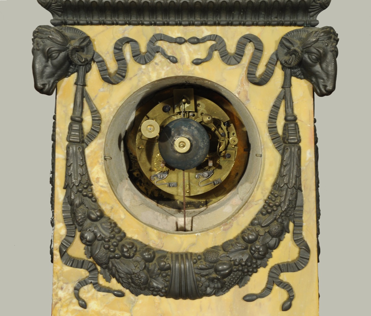 Une PENDULE en marbre surmontée d'une déesse mythologique en bronze, à la chevelure rayonnante. Riche ornementation toutes faces de béliers, sphinx, guirlandes de fleurs, oves et rubans.
