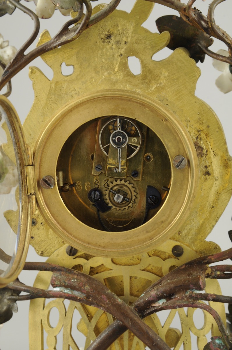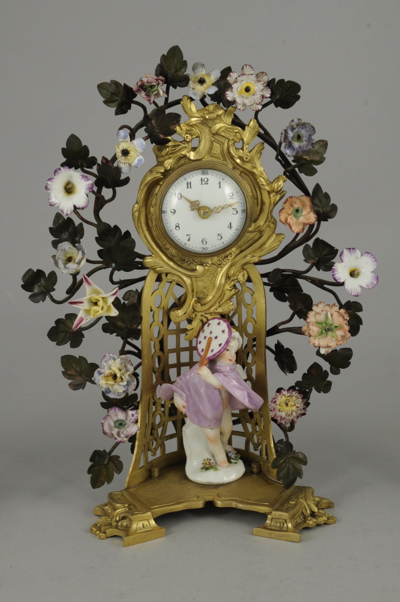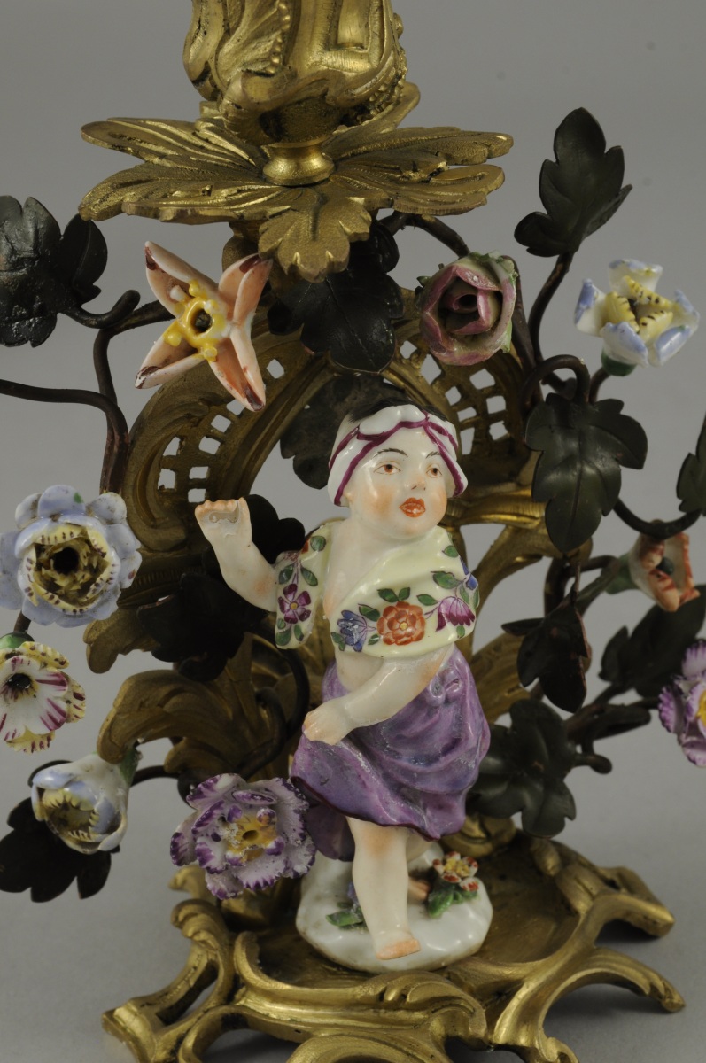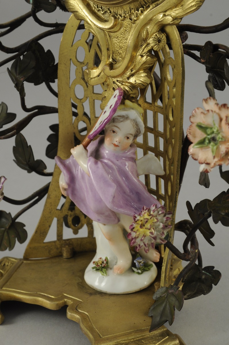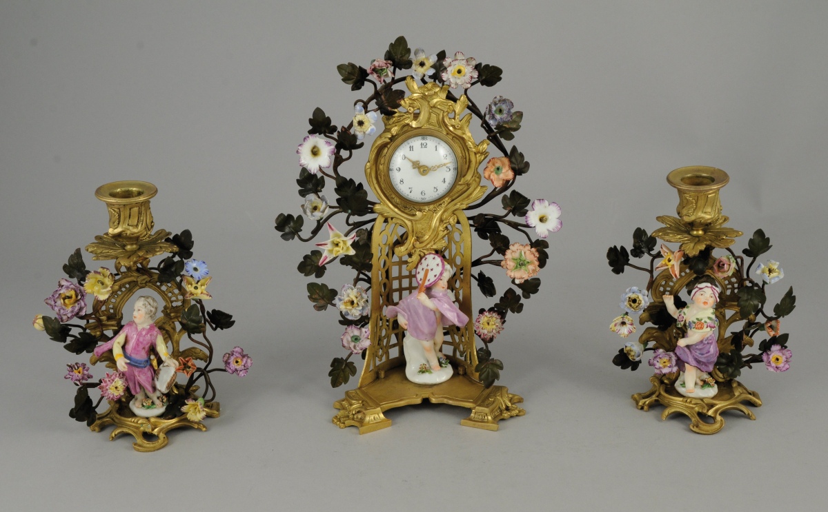 GARNITURE de CHEMINÉE en porcelaine polychrome comprenant une pendule et deux bougeoirs. Sur chaque base, un enfant sur un tertre fleuri. Le cadran émaillé blanc aux chiffres arabes, enserré dans une arborescence garnie de fleurs polychromes. Monture en bronze doré ajouré de style rocaille.