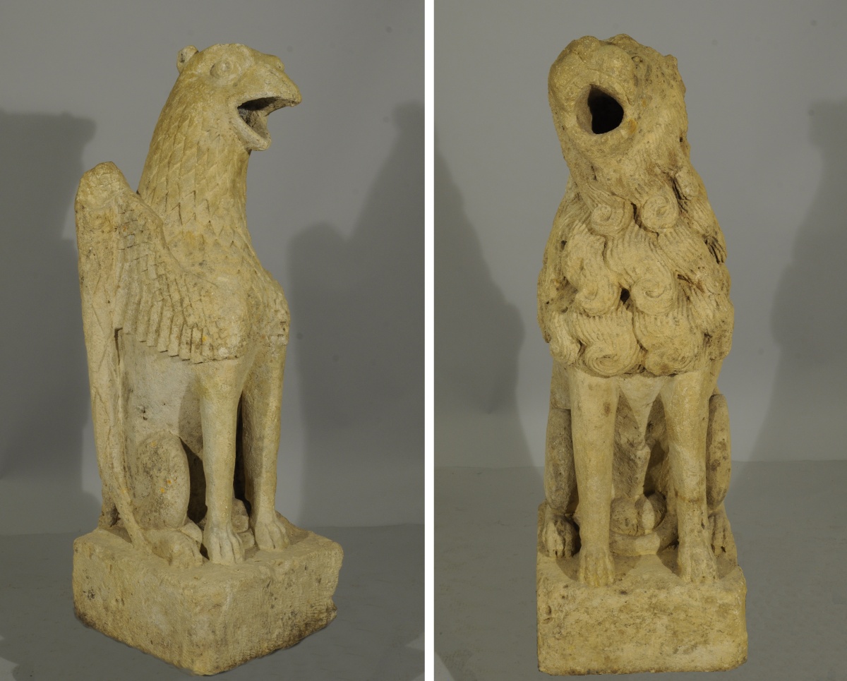 Belle PAIRE de GARGOUILLES en pierre calcaire sculptée figurant un LION et un GRIFFON ALLONGÉS. La crinière du lion et les plumes d'aigle du griffon sont délicatement sculptées. Les deux animaux présentent une virilité affirmée.