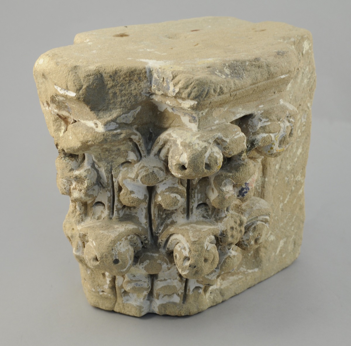 CHAPITEAU D'ANGLE en pierre calcaire sculptée en fort relief de feuilles recourbées. Traces de polychromie.