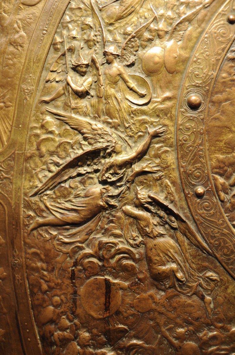 Bouclier d'ornement, dit de Milton, sur le thème du Paradis Perdu, réalisé par la Maison britannique Elkington (Birmingham, Royaume-Uni, entre 1824 et 1968). Ce bouclier forme une paire avec le bouclier d'ornement dit "de Bunyan". L'original en argent a été présenté à l'Exposition universelle de 1867 à Paris. Cette oeuvre qui a fait sensation a été achetée 3.000 £ par le gouvernement britannique, alors que des copies en galvanoplastie étaient éditées. L'original est, depuis, conservé au Victoria & Albert Museum. Le Musée d'Orsay à Paris a acquis une édition en galvanoplastie, en 2009, qu'il conserve sous le numéro d'inventaire OAO 1773 1.