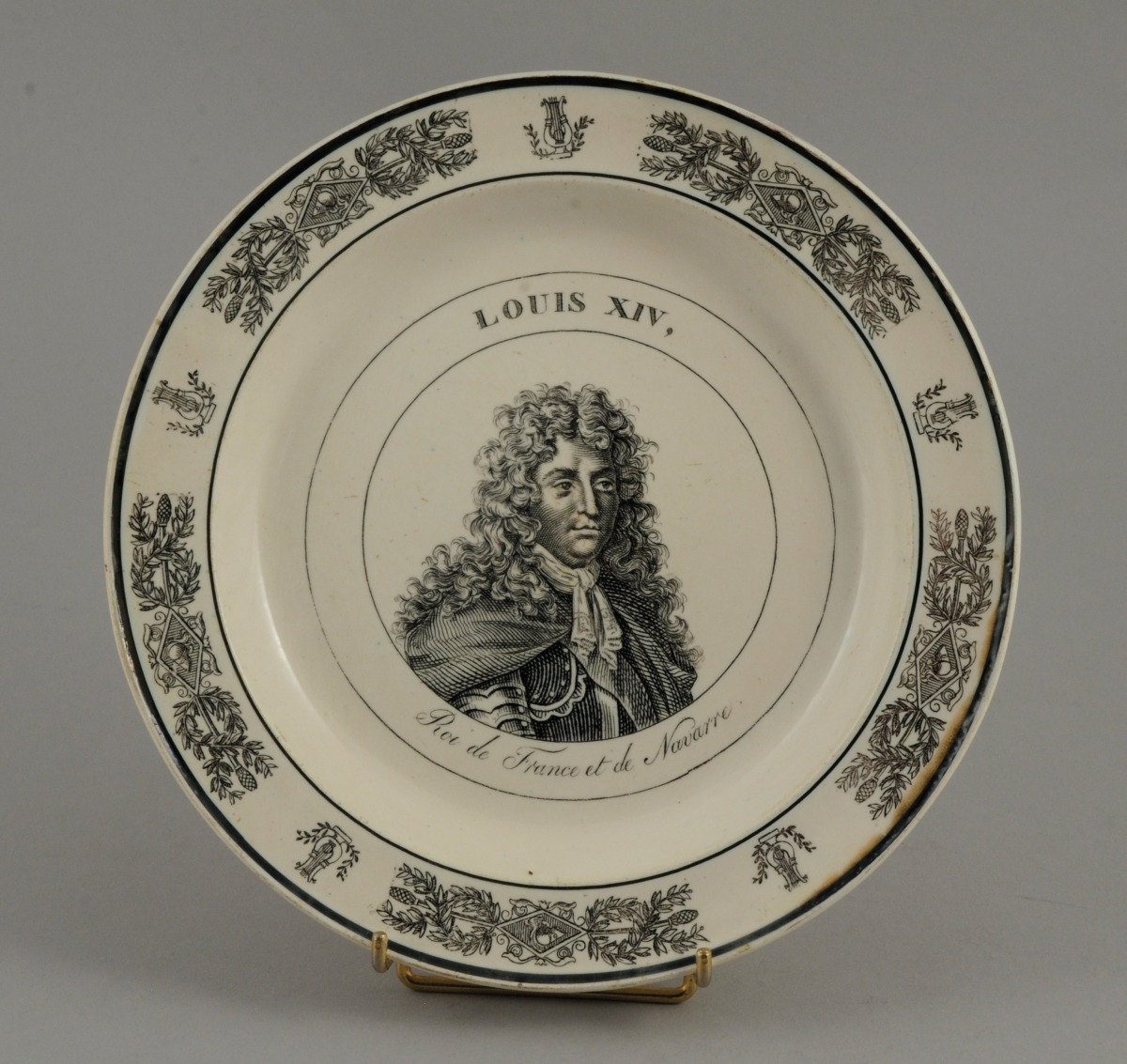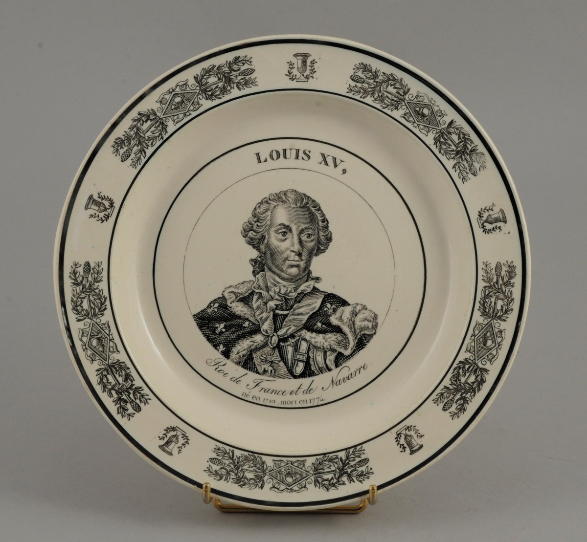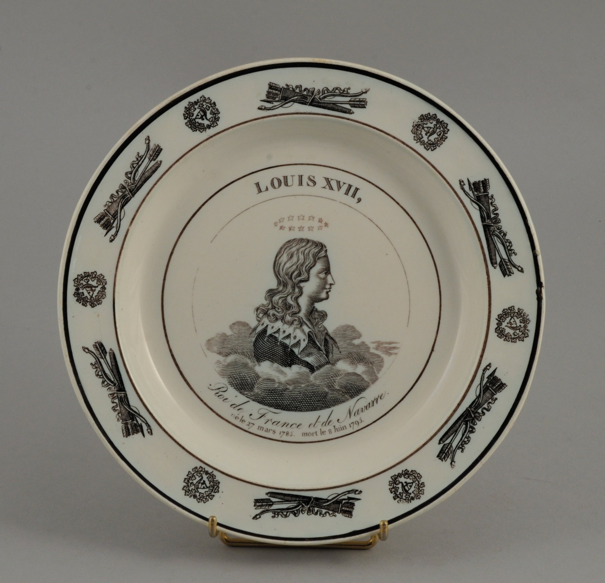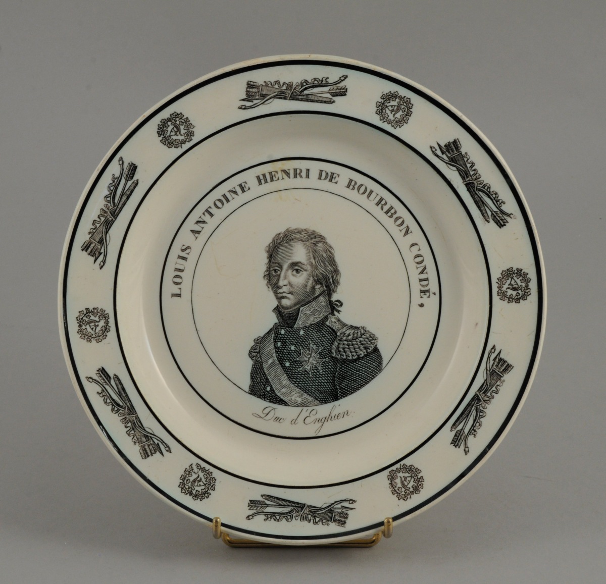 Suite de douze assiettes en faïence imprimée du profil des Bourbons, l'aile ornée de trophées aux angelots alternant avec des vases médicis : Henri IV, Louis XIV, Louis XV, Louis XVI, Marie-Antoinette, Louis XVII, le Duc d'Enghien, Louis XVIII, le Comte d'Artois, le Duc d'Angoulême, la Duchesse d'Angoulême, le Duc de Berry.