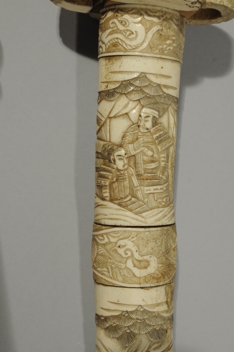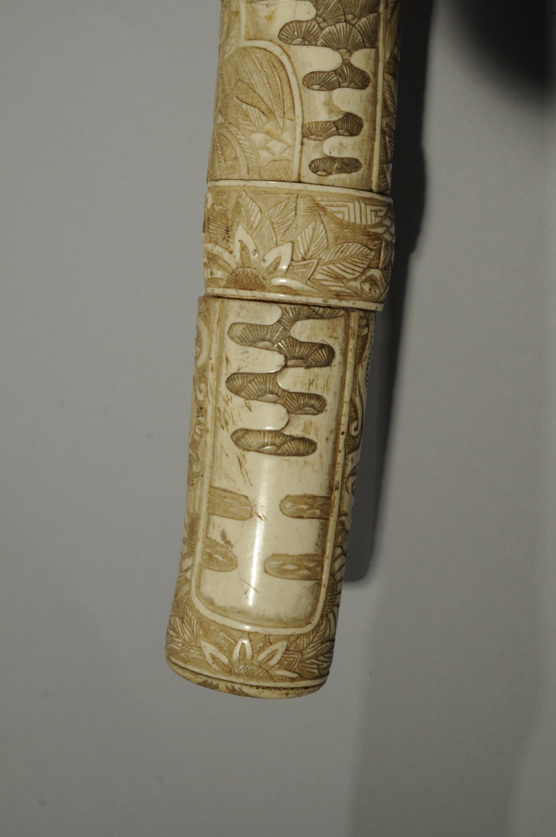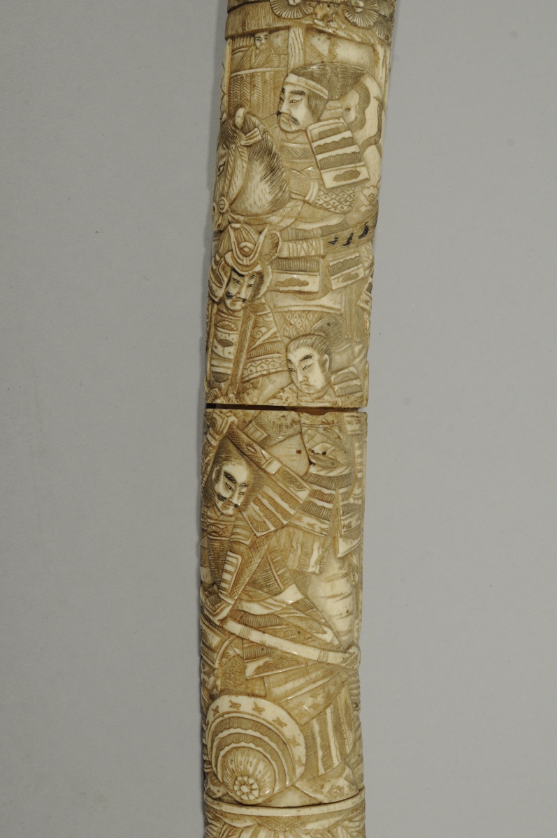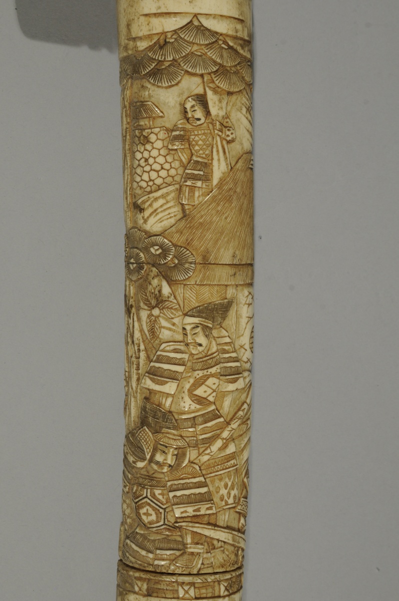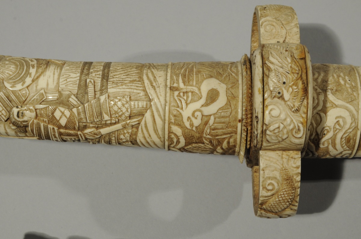 Grand SABRE DE PARADE en os à patine jaune, à décor sculpté de samuraï et personnages.