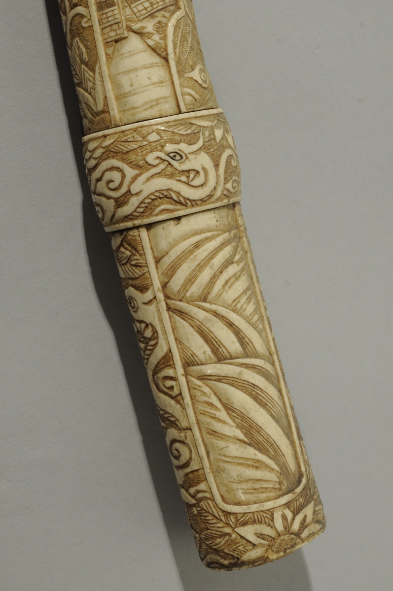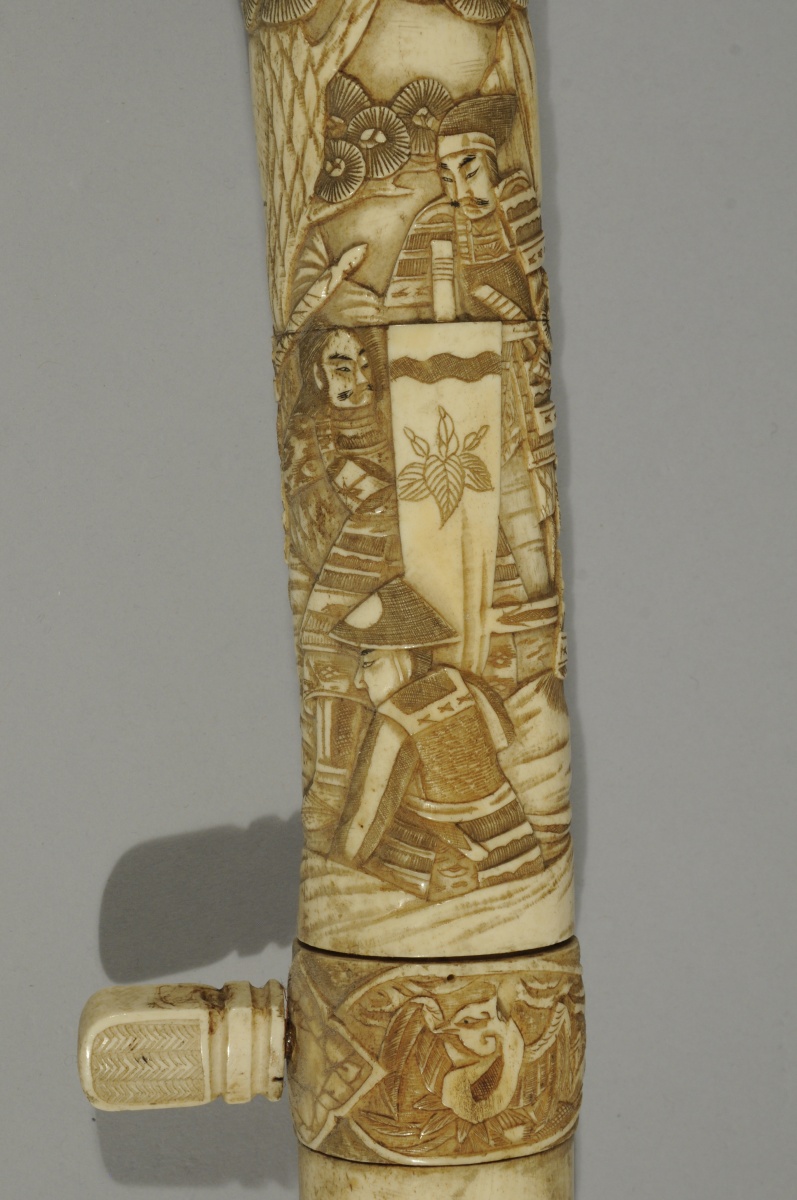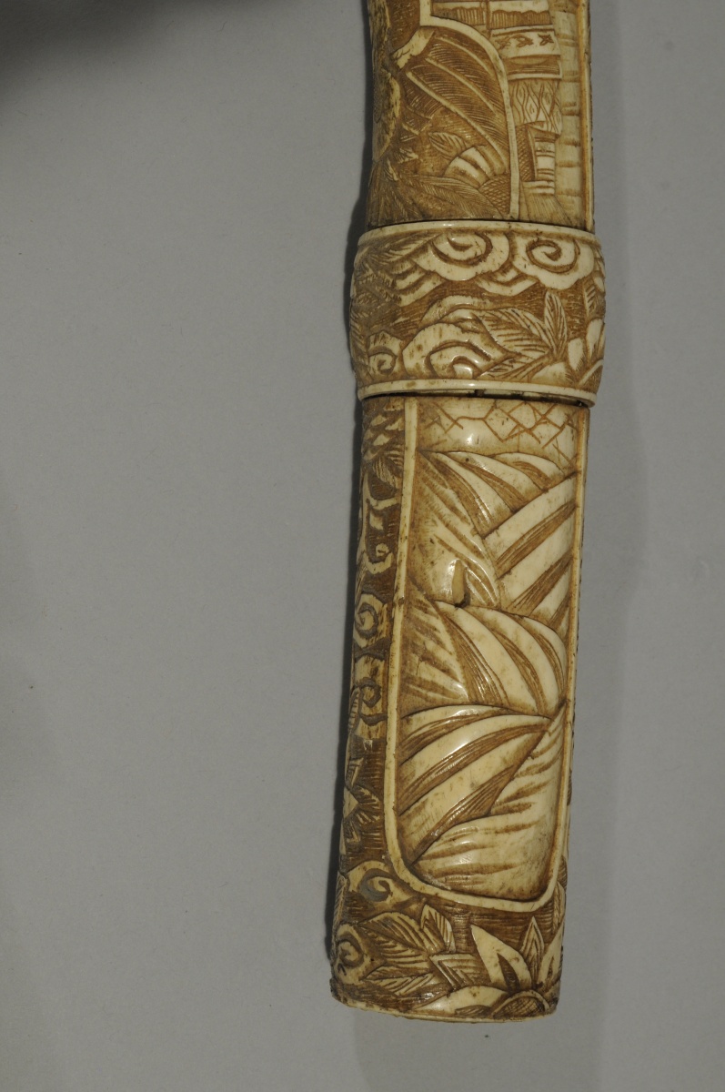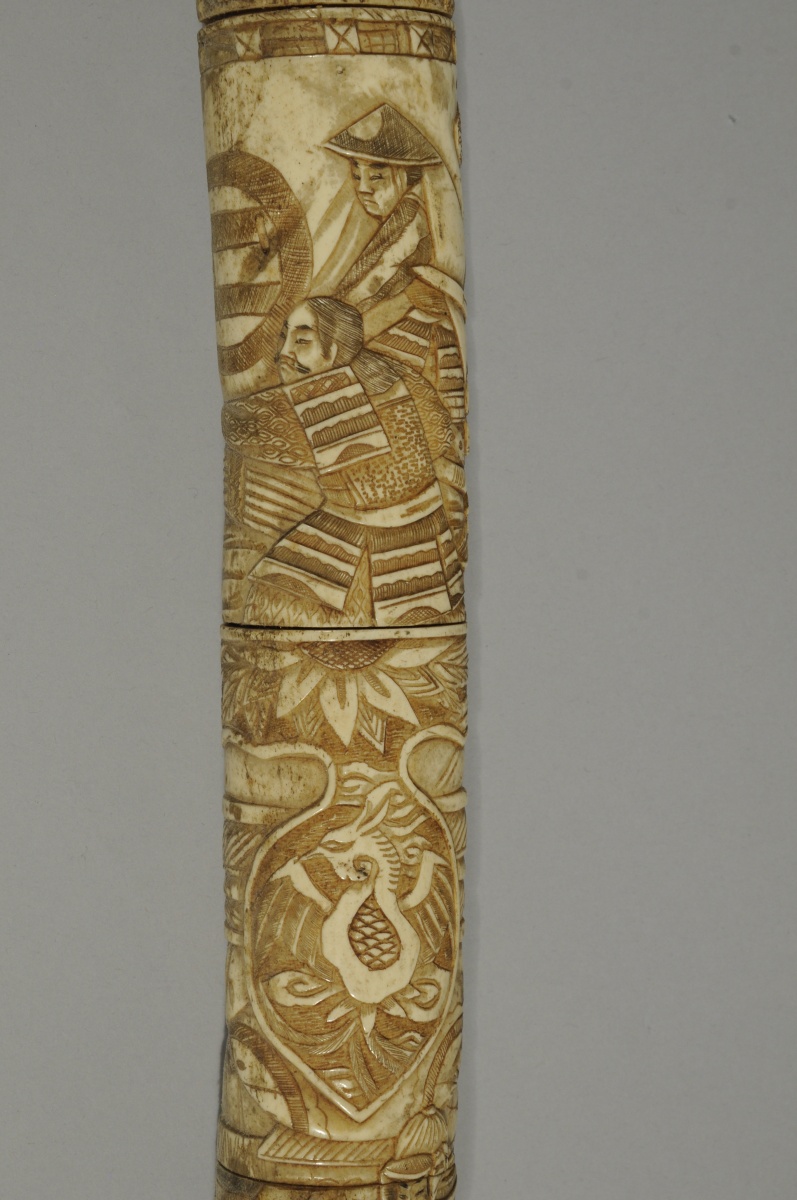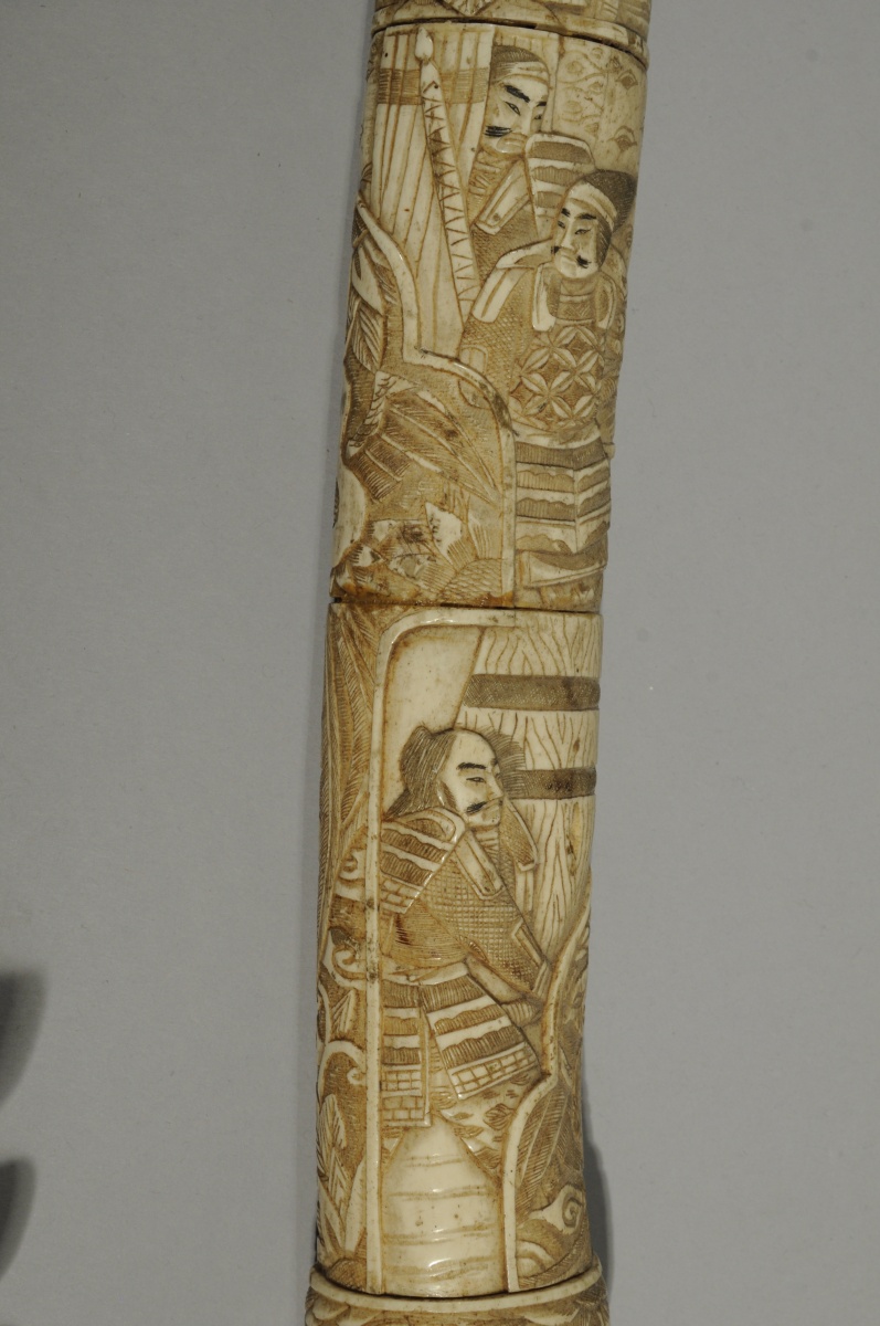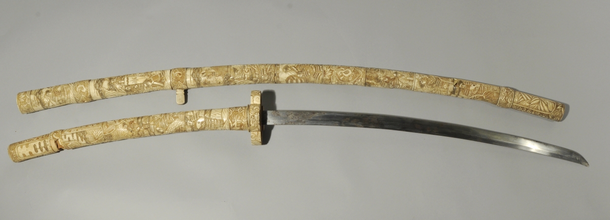 Grand SABRE DE PARADE en os à patine jaune, à décor sculpté de samuraï et personnages.