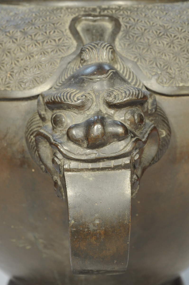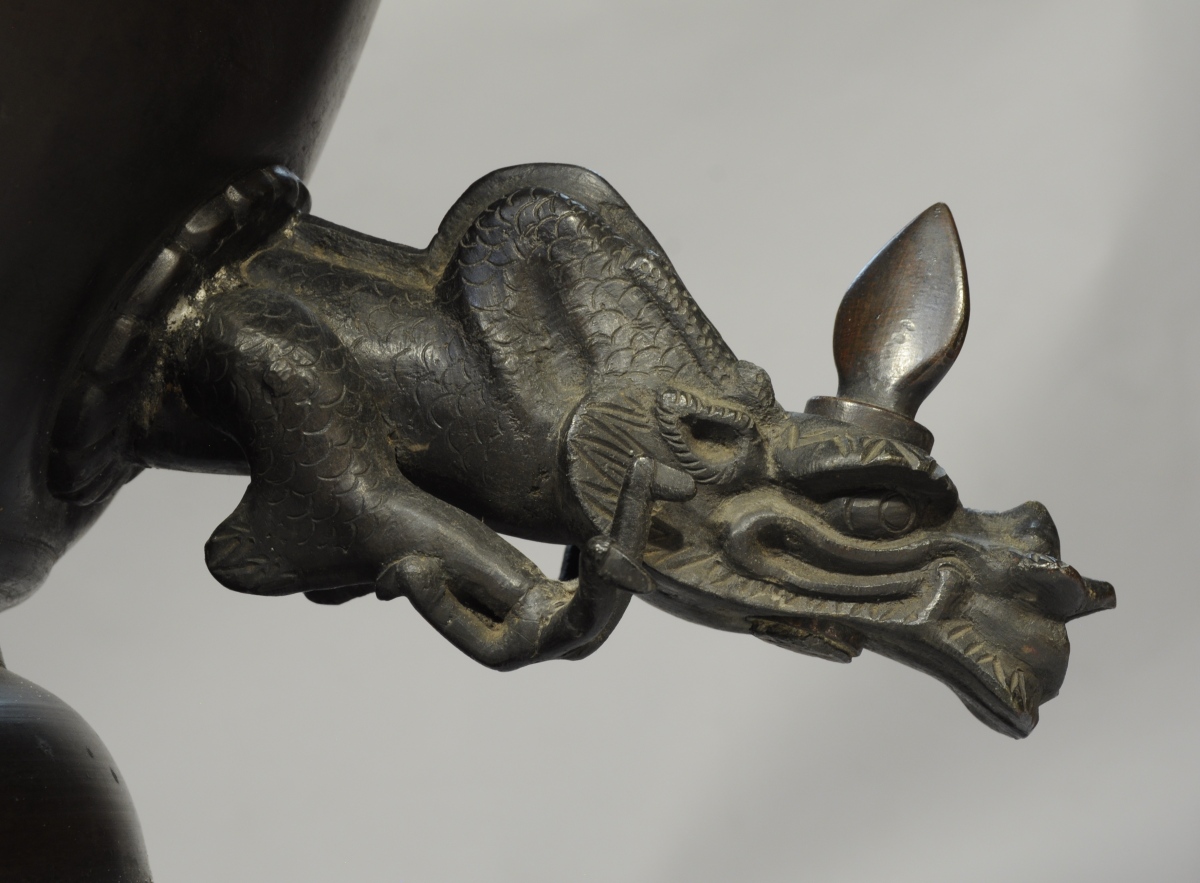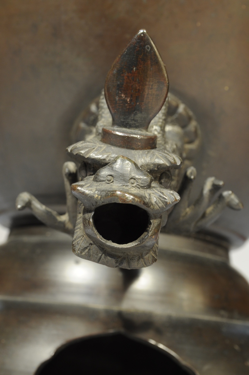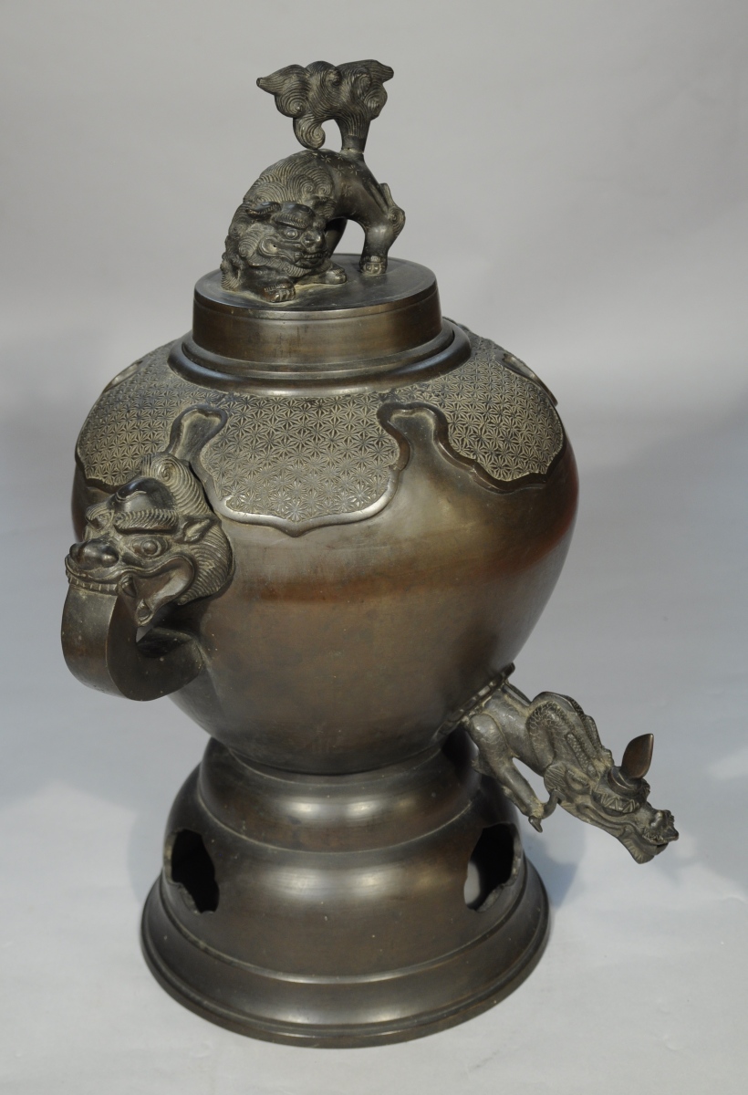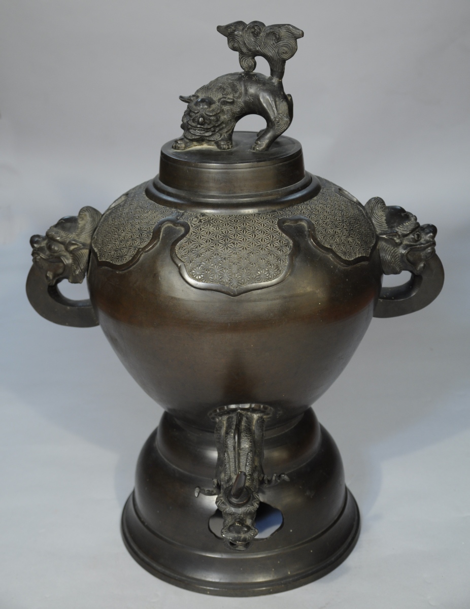 FONTAINE AU DRAGON en bronze patiné de forme boule, à six réserves fleuries sur la partie supérieure. Ornée de deux anses à tête de lion, le couvercle est surmonté d'un fretel à chien de Fô grimaçant. Le robinet en dragon jaillissant. Sur un socle ajouré, à doucine.