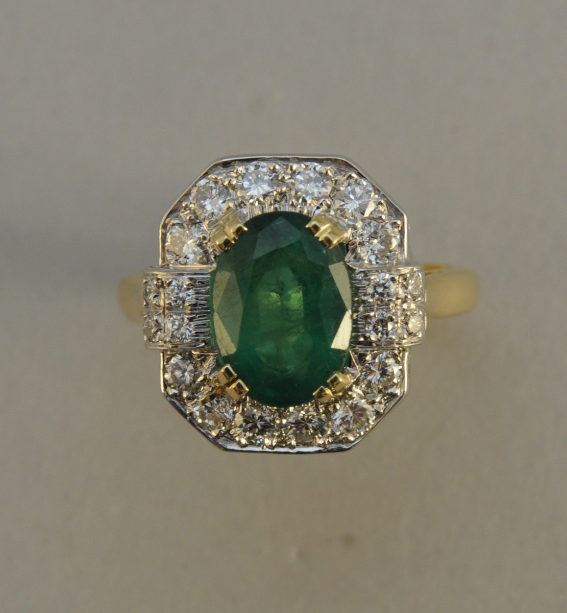 BAGUE de forme octogonale en or jaune sertie d'une émeraude de taille ovale dans un entourage de douze et huit diamants de taille moderne de 0,80 carat environ.