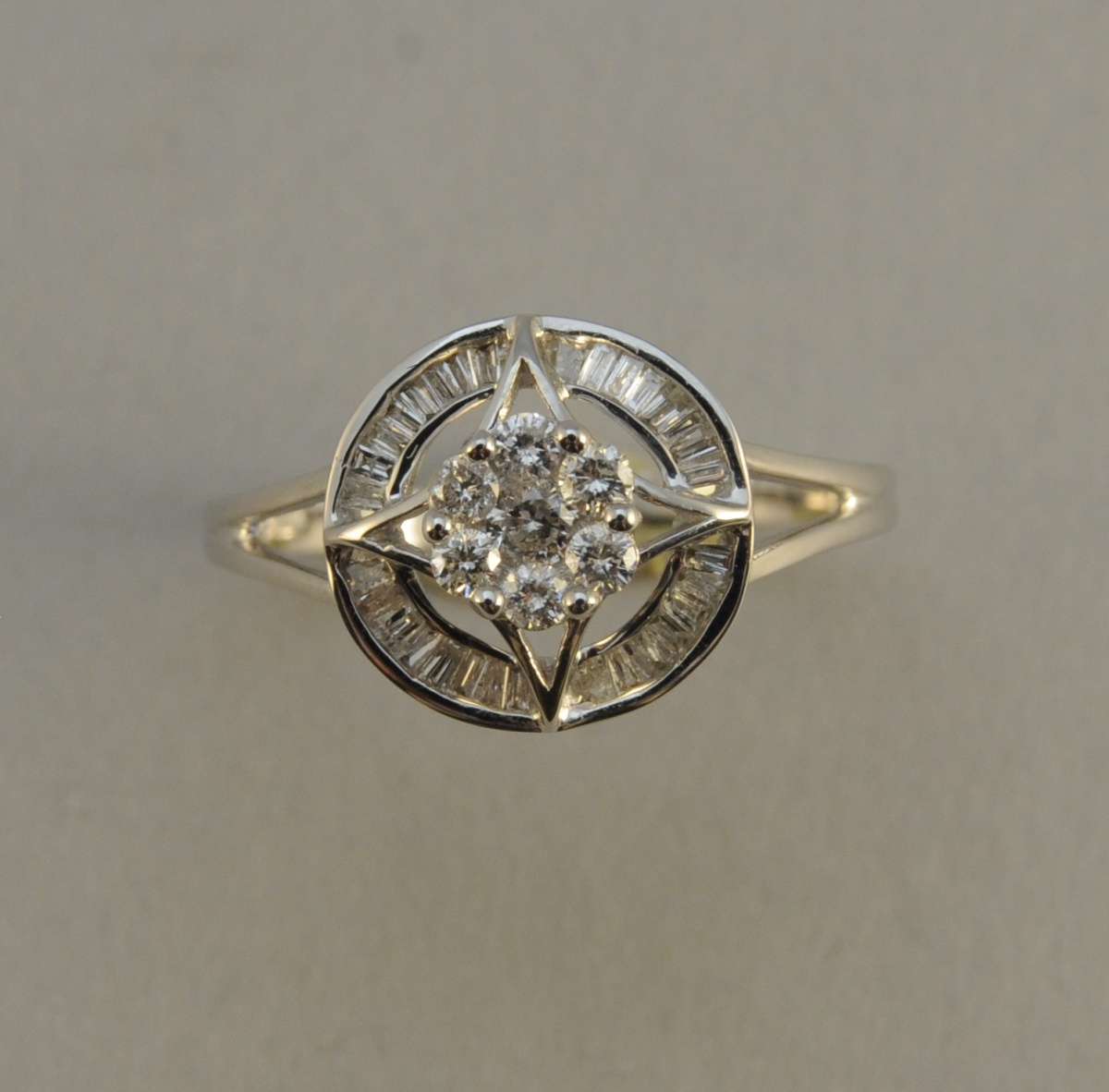 BAGUE de forme ronde à décor ajouré ornée en son centre d'un pavage de sept diamants de taille moderne de 0,20 carat environ. Le cercle est quant à lui serti de 30 diamants de taille baguette de 0,15 carat environ.