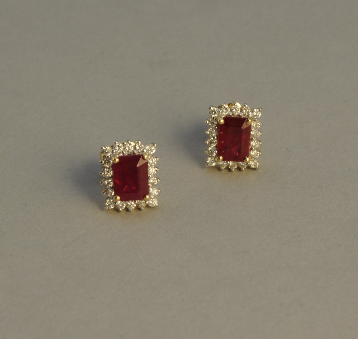 PAIRE DE BOUTONS D'OREILLE de forme rectangulaire en or jaune ornés d'un rubis probablement birman de taille émeraude dans un entourage de 18 diamants de taille moderne de 0,50 carat environ. Fermoirs à poussette belge.