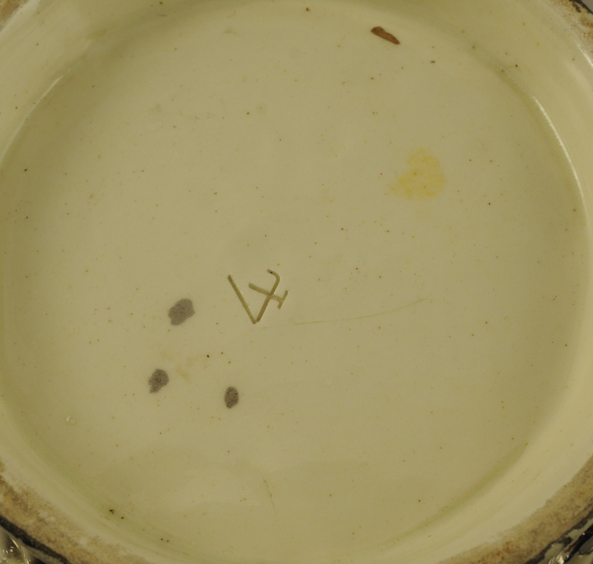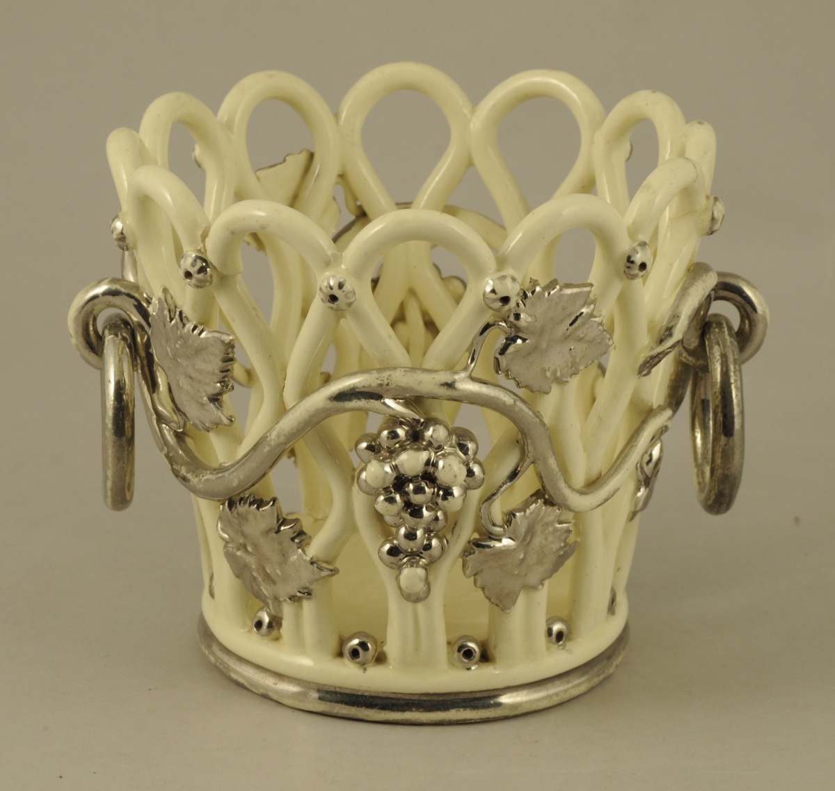 LANGEAIS. CORBEILLE cache-pot circulaire en faïence fine à fond blanc crémeux. Anses mobiles et décor de pampres de vigne et de grappes relevé de lustre platine. Fin XIXème. Haut. 14, Diam. 16 cm.