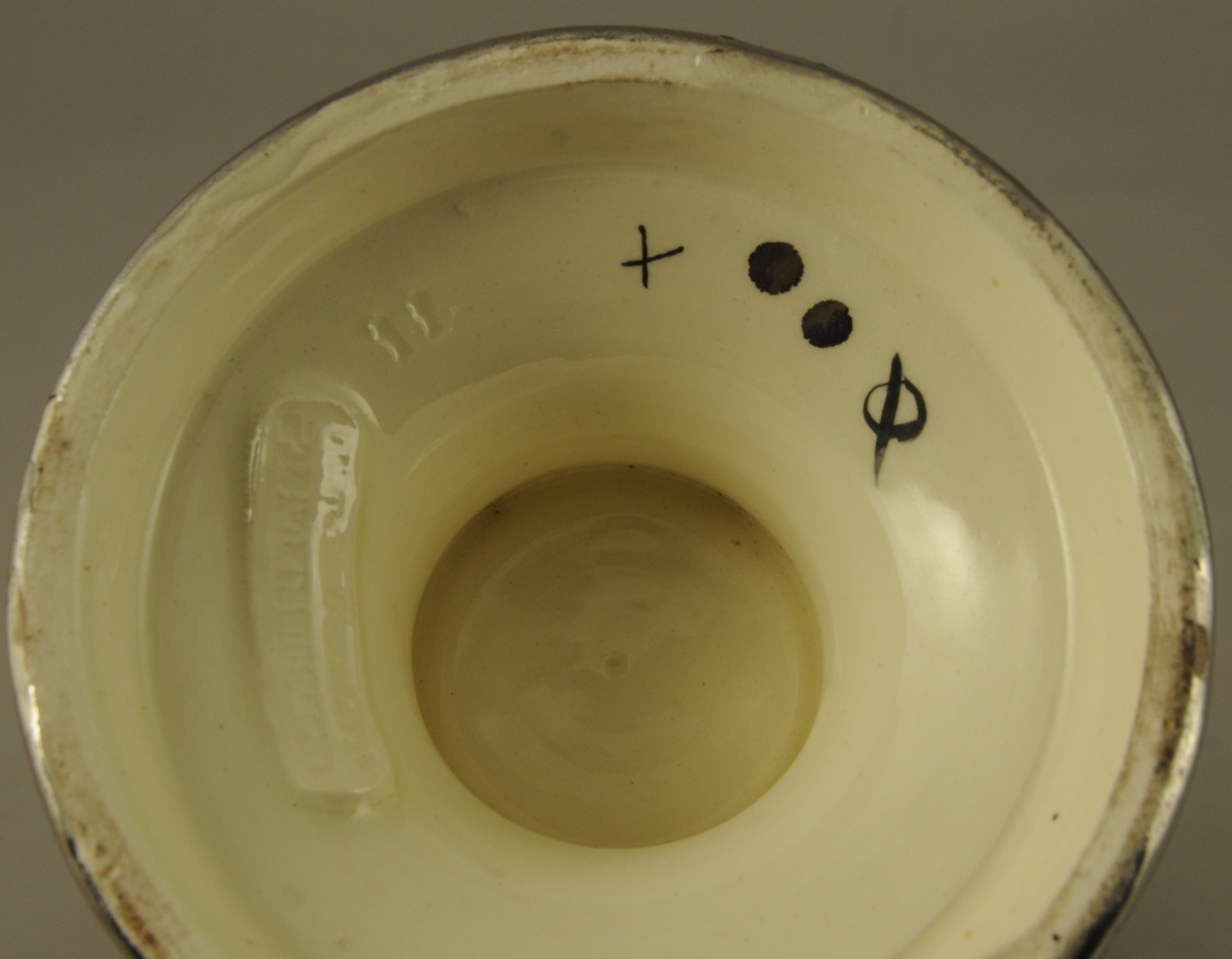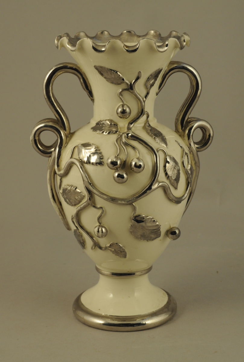 LANGEAIS. VASE balustre en faïence fine à fond blanc crémeux. Anses à enroulements et décor de branches et de fruits relevé de lustre platine. Marque en creux sous la base : "Ch. de Boissimon et Cie à Langeais (Indre-et-Loire)". Fin XIXème. Haut. 28, Diam. 14 cm. (petite ébréchure avec fèle au col)