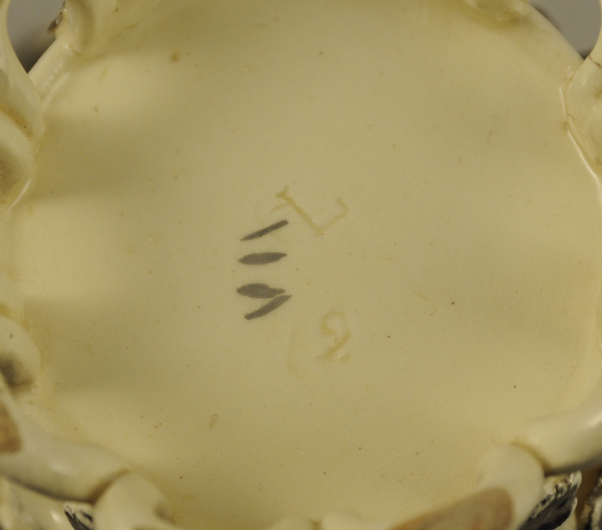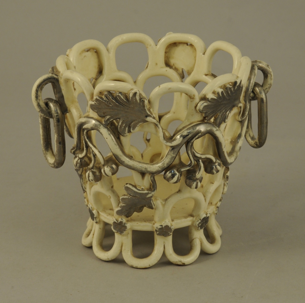LANGEAIS. CORBEILLE cache-pot circulaire en faïence fine à fond blanc crémeux. Anses mobiles et décor de rinceaux et de fruits relevé de lustre platine. Fin XIXème. Haut. 14, Diam. 13 cm. (un manque et un fêle à la base)