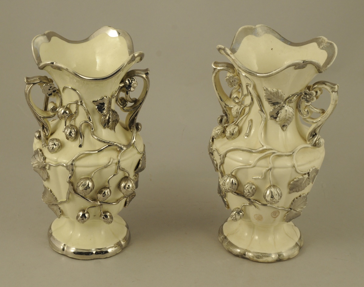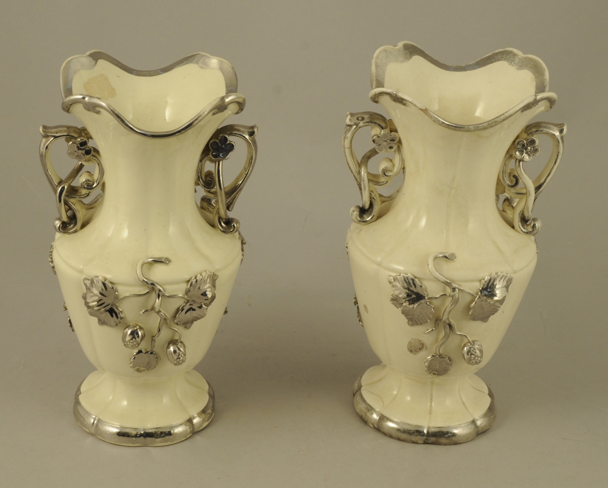LANGEAIS. DEUX VASES balustre formant paire en faïence fine à fond blanc crémeux. Anses en forme de rinceaux et décor de branches et de fruits relevé de lustre platine. Fin XIXème. Haut. 22, 5 et 23, Diam. 11 cm. (accidents)