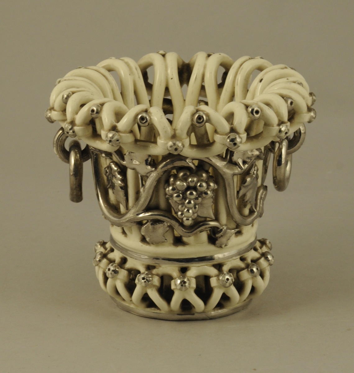 LANGEAIS. CORBEILLE cache-pot circulaire en faïence fine à fond blanc crémeux. Anses mobiles et décor de pampres de vigne et de grappes relevé de lustre platine. Marque en creux sous la base : "Ch. de Boissimon et Cie à Langeais (Indre-et-Loire)". Fin XIXème. Haut. 14,5, Diam. 17 cm.